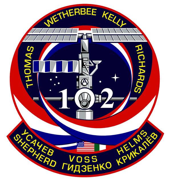 This is the STS-102 mission crew insignia. The central image on the crew patch depicts the International Space Station (ISS) in the build configuration that it had at the time of the arrival and docking of Discovery during the STS-102 mission, the first crew exchange flight to the Space Station. The station is shown along the direction of the flight as was seen by the shuttle crew during their final approach and docking, the so-called V-bar approach. The names of the shuttle crew members are depicted in gold around the top of the patch, and surnames of the Expedition crew members being exchanged are shown in the lower barner. The three ribbons swirling up to and around the station signify the rotation of these ISS crew members. The number 2 is for the Expedition 2 crew who flew up to the station, and the number 1 is for the Expedition 1 crew who then returned down to Earth. In conjunction with the face of the Lab module of the Station, these Expedition numbers create the shuttle mission number 102. Shown mated below the ISS is the Italian-built Multipurpose Logistics Module, Leonardo, that flew for the first time on this flight. The flags of the countries that were the major contributors to this effort, the United States, Russia, and Italy are also shown in the lower part of the patch. The build-sequence number of this flight in the overall station assembly sequence, 5A.1, is captured by the constellations in the background.