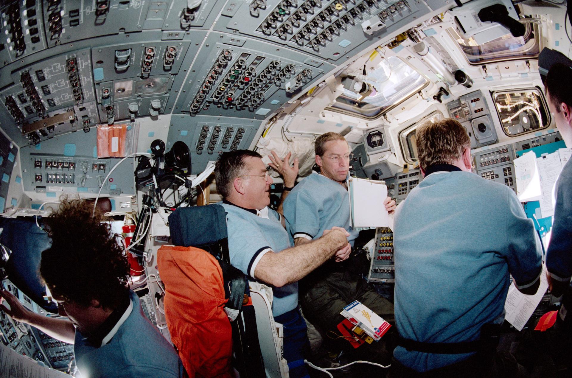 STS-102 mission astronauts James S. Voss and James D. Weatherbee share a congratulatory handshake as the Space Shuttle Orbiter Discovery successfully docks with the International Space Station (ISS). Photographed from left to right are: Astronauts Susan J. Helms, mission specialist; James S. Voss, Expedition 2 crew member; James D. Weatherbee, mission commander; Andrew S.W. Thomas, mission specialist; and nearly out of frame is James M. Kelley, Pilot. Launched March 8, 2001, STS-102's primary cargo was the Leonardo, the Italian Space Agency-built Multipurpose Logistics Module (MPLM). The Leonardo MPLM is the first of three such pressurized modules that will serve as ISS' moving vans, carrying laboratory racks filled with equipment, experiments, and supplies to and from the Station aboard the Space Shuttle. The cylindrical module is approximately 21-feet long and 15- feet in diameter, weighing almost 4.5 tons. It can carry up to 10 tons of cargo in 16 standard Space Station equipment racks. Of the 16 racks the module can carry, 5 can be furnished with power, data, and fluid to support refrigerators or freezers. In order to function as an attached station module as well as a cargo transport, the logistics module also includes components that provide life support, fire detection and suppression, electrical distribution, and computer functions. NASA's 103rd overall mission and the 8th Space Station Assembly Flight, STS-102 mission also served as a crew rotation flight. It delivered the Expedition Two crew to the Station and returned the Expedition One crew back to Earth.