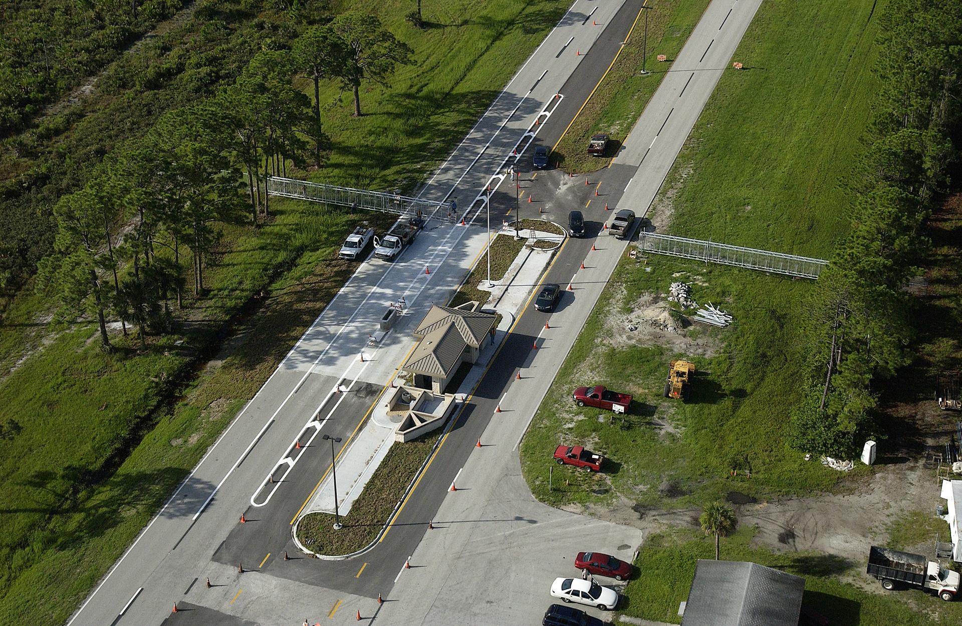 KENNEDY SPACE CENTER, FLA. – Looking south, the new security gate on S.R. 3 is seen from the air.