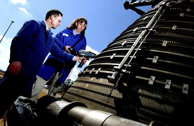 Teamed with KeyMaster Technologies, Kennewick, Washington, the Marshall Space Flight Center engineers have developed a portable vacuum analyzer that performs on-the-spot chemical analyses under field conditions— a task previously only possible in a chemical laboratory. The new capability is important not only to the aerospace industry, but holds potential for broad applications in any industry that depends on materials analysis, such as the automotive and pharmaceutical industries. Weighing in at a mere 4 pounds, the newly developed handheld vacuum X-ray fluorescent analyzer can identify and characterize a wide range of elements, and is capable of detecting chemical elements with low atomic numbers, such as sodium, aluminum and silicon. It is the only handheld product on the market with that capability. Aluminum alloy verification is of particular interest to NASA because vast amounts of high-strength aluminum alloys are used in the Space Shuttle propulsion system such as the External Tank, Main Engine, and Solid Rocket Boosters. This capability promises to be a boom to the aerospace community because of unique requirements, for instance, the need to analyze Space Shuttle propulsion systems on the launch pad. Those systems provide the awe-inspiring rocket power that propels the Space Shuttle from Earth into orbit in mere minutes. The scanner development also marks a major improvement in the quality assurance field, because screws, nuts, bolts, fasteners, and other items can now be evaluated upon receipt and rejected if found to be substandard. The same holds true for aluminum weld rods. The ability to validate the integrity of raw materials and partially finished products before adding value to them in the manufacturing process will be of benefit not only to businesses, but also to the consumer, who will have access to a higher value product at a cheaper price. Three vacuum X-ray scanners are already being used in the Space Shuttle Program. The External Tank Project Office is using one for aluminum alloy analysis, while a Marshall contractor is evaluating alloys with another unit purchased for the Space Shuttle Main Engine Office. The Reusable Solid Rocket Motor Project Office has obtained a scanner that is being used to test hardware and analyze materials. In this photograph, Richard Booth, Marshall Engineering Directorate, and Wanda Hudson, ATK Thiokol, use an enhanced vacuum X-ray fluorescent scanner to analyze materials in an F-1 engine, which was used to boost the Saturn V rocket from Earth’s orbit that carried astronauts to the moon in the 1960s.