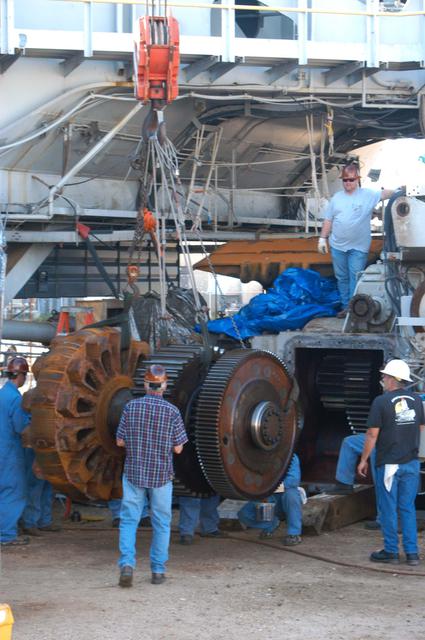 KENNEDY SPACE CENTER, FLA. - Workers get ready to install the giant-sized sprocket (left side) and gear (right side) on the Crawler-Transporter behind it.The drive sprocket turns the belt on the CT. The sprocket is mated to the gear that attaches to the drive motor. The CT travels on eight tracked tread belts, each containing 57 tread belt shoes, for a combined weight of 957,600 pounds. The CT carries the Space Shuttle atop its Mobile Launcher Platform, adding another 12 million pounds, from the Vehicle Assembly Building to the launch pad. NASA and United Space Alliance (USA) CT system engineers and USA technicians are repairing the sprockets and rollers on each belt before new shoes are installed. Replacement of the sprockets, gears and shoes is part of the most extensive maintenance work performed on the CT in its history.