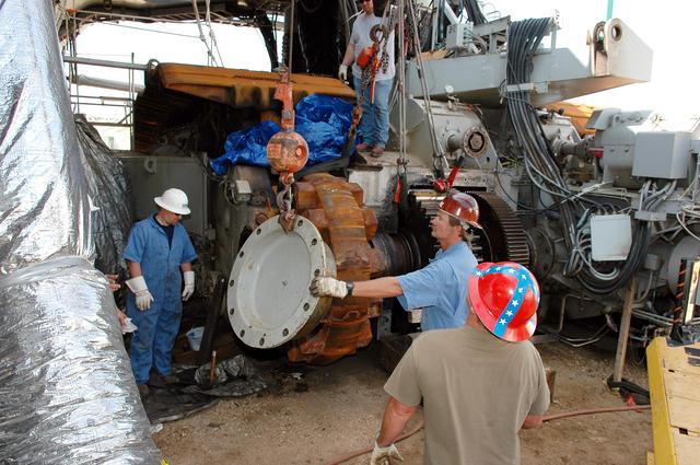 KENNEDY SPACE CENTER, FLA. - Workers move the hub toward the gear, where it will be attached, on the Crawler-Transporter. The drive sprocket turns the belt on the CT. The sprocket is mated to the gear that attaches to the drive motor. The CT travels on eight tracked tread belts, each containing 57 tread belt shoes, for a combined weight of 957,600 pounds. The CT carries the Space Shuttle atop its Mobile Launcher Platform, adding another 12 million pounds, from the Vehicle Assembly Building to the launch pad. NASA and United Space Alliance (USA) CT system engineers and USA technicians are repairing the sprockets and rollers on each belt before new shoes are installed. Replacement of the sprockets, gears and shoes is part of the most extensive maintenance work performed on the CT in its history.