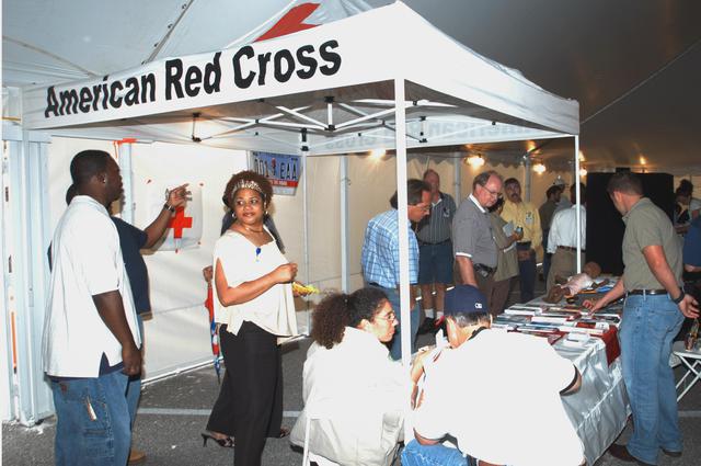 KENNEDY SPACE CENTER, FLA. - KSC Employees stop by the American Red Cross exhibit during Spaceport Super Safety and Health Day. The event included guest speakers Dr. Pamela Peeke, Navy Com. Stephen E. Iwanowicz, NASA’s Dr. Kristine Calderon and Olympic-great Bruce Jenner. In addition, many vendors’ exhibits were on display for employees. Super Safety and Health Day was initiated at KSC in 1998 to increase awareness of the importance of safety and health among the government and contractor workforce. The theme for this year’s event was “Safety and Health: A Winning Combination.”