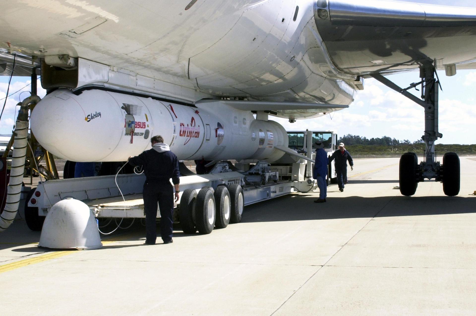 KENNEDY SPACE CENTER, FLA. - At Vandenberg Air Force Base in California, Orbital Sciences Corporation technicians complete attachment of the Demonstration of Autonomous Rendezvous Technology (DART) spacecraft and Orbital Sciences Pegasus launch vehicle, to the Stargazer L-1011 aircraft above. The Pegasus XL will launch DART at approximately 40,000 feet above the Pacific Ocean into a circular polar orbit of approximately 475 miles. DART was designed and built for NASA by Orbital Sciences as an advanced flight demonstrator to locate and maneuver near an orbiting satellite. The DART spacecraft weighs about 800 pounds and is nearly 6 feet long and 3 feet in diameter. The DART satellite provides a key step in establishing autonomous rendezvous capabilities for the U.S. Space Program. While previous rendezvous and docking efforts have been piloted by astronauts, the unmanned DART satellite will have computers and cameras to perform its rendezvous functions.
