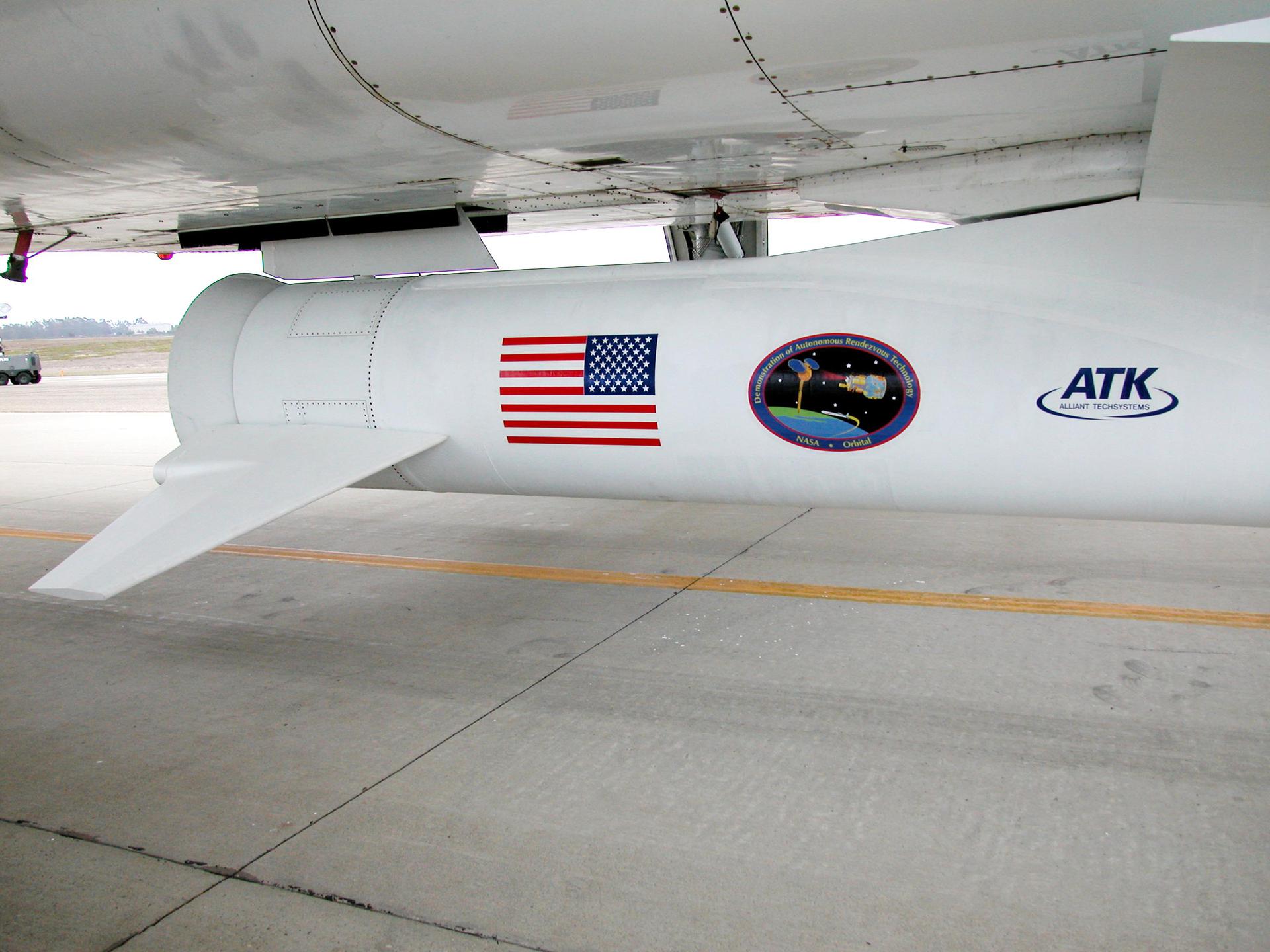 KENNEDY SPACE CENTER, FLA. - At Vandenberg Air Force Base in California, the Demonstration of Autonomous Rendezvous Technology (DART) is mated to the belly of the Orbital Sciences Corporation Stargazer L-1011 aircraft. DART was designed and built for NASA by Orbital Sciences as an advanced flight demonstrator to locate and maneuver near an orbiting satellite. The DART spacecraft weighs about 800 pounds and is nearly 6 feet long and 3 feet in diameter. From beneath the belly of the Orbital Sciences L-1011 aircraft, the Pegasus XL vehicle will launch DART into a circular polar orbit of approximately 475 miles. The DART satellite provides a key step in establishing autonomous rendezvous capabilities for the U.S. Space Program. While previous rendezvous and docking efforts have been piloted by astronauts, the unmanned DART satellite will have computers and cameras to perform its rendezvous functions.