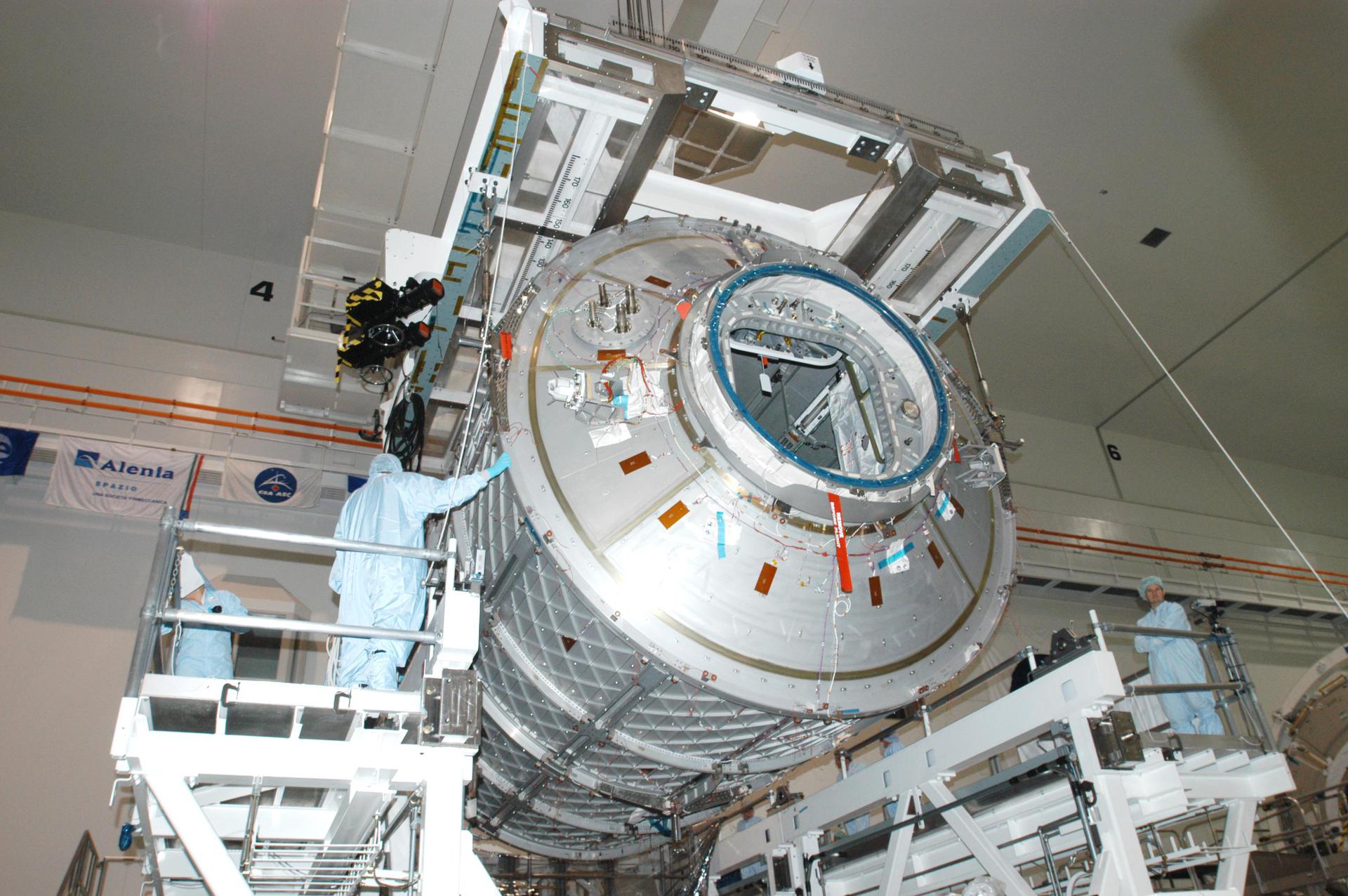KENNEDY SPACE CENTER, FLA. - In the Space Station Processing Facility, workers guide the Multi-Purpose Logistics Module Leonardo as it is lowered toward the Cargo Element Work Stand that Raffaello recently vacated. The payload canister was a temporary location during the switch. Three MPLMs were built by the Italian Space Agency - Donatello, Leonardo and Raffaello - to serve as a reusable logistics carrier and primary delivery system to resupply and return cargo requiring a pressurized environment to the International Space Station.