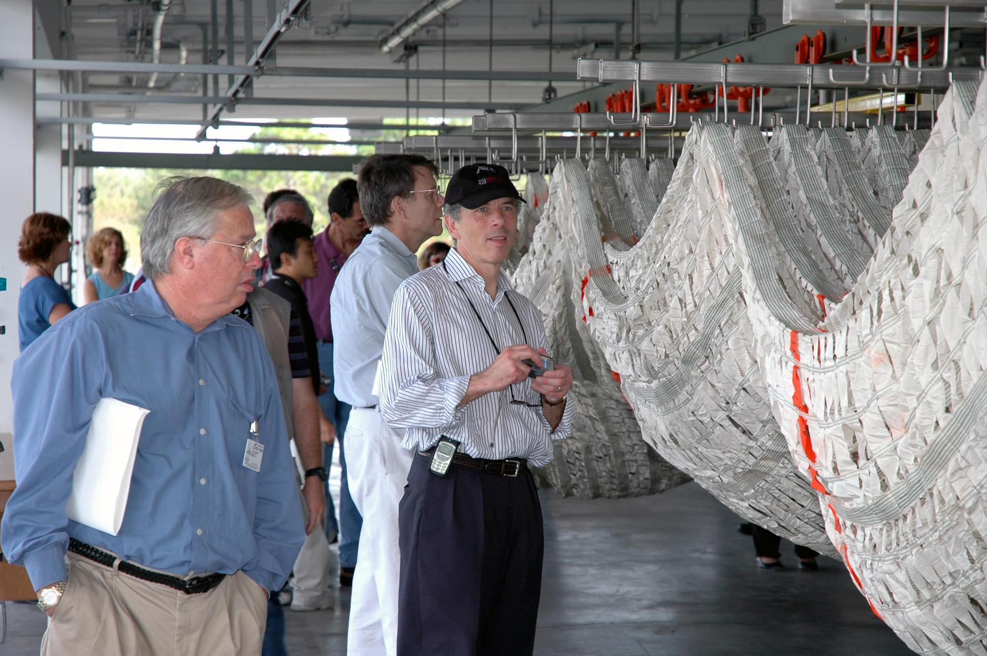 KENNEDY SPACE CENTER, FLA. - The media tour the Parachute Refurbishment Facility, which cleans and repairs the Solid Rocket Booster (SRB) parachutes after a Space Shuttle launch. The stop was part of a day-long event that featured the movement of the first SRB segments to the Vehicle Assembly Building for stacking for Return to Flight mission STS-114. Two SRBs support the liftoff of the Space Shuttle on a launch. The twin 149-foot tall, 12-foot diameter SRBs provide the main propulsion system during launch to place the orbiters in the proper orbit around the Earth. They operate parallel with the Space Shuttle main engines for the first two minutes of flight and jettison away from the orbiter, with help from the Booster Separation Motors, about 26.3 nautical miles above the Earth’s surface.
