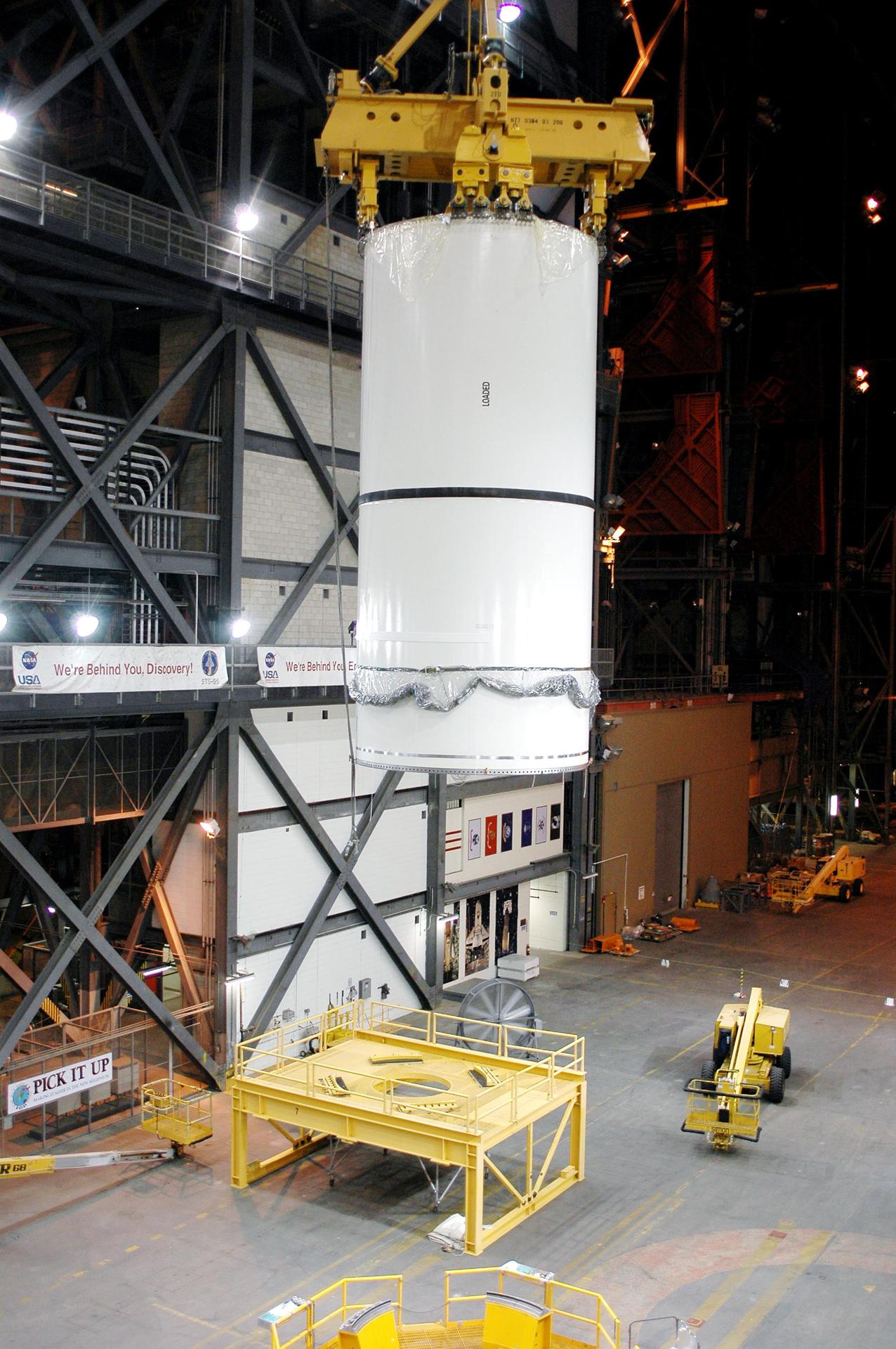 KENNEDY SPACE CENTER, FLA. - In the transfer aisle of the Vehicle Assembly Building (VAB), a segment of a Solid Rocket Booster (SRB) is lifted from a transporter toward the 16th level. This right aft center segment will be stacked with the aft booster that arrived in the VAB Nov. 22 for the Return to Flight mission STS-114. Two SRBs are stacked on the Mobile Launch Platform and later joined by the External Tank.. The twin 149-foot tall, 12-foot diameter SRBs provide the main propulsion system during launch. They operate parallel with the Space Shuttle main engines for the first two minutes of flight and jettison away from the orbiter with help from the Booster Separation Motors, about 26.3 nautical miles above the Earth’s surface.