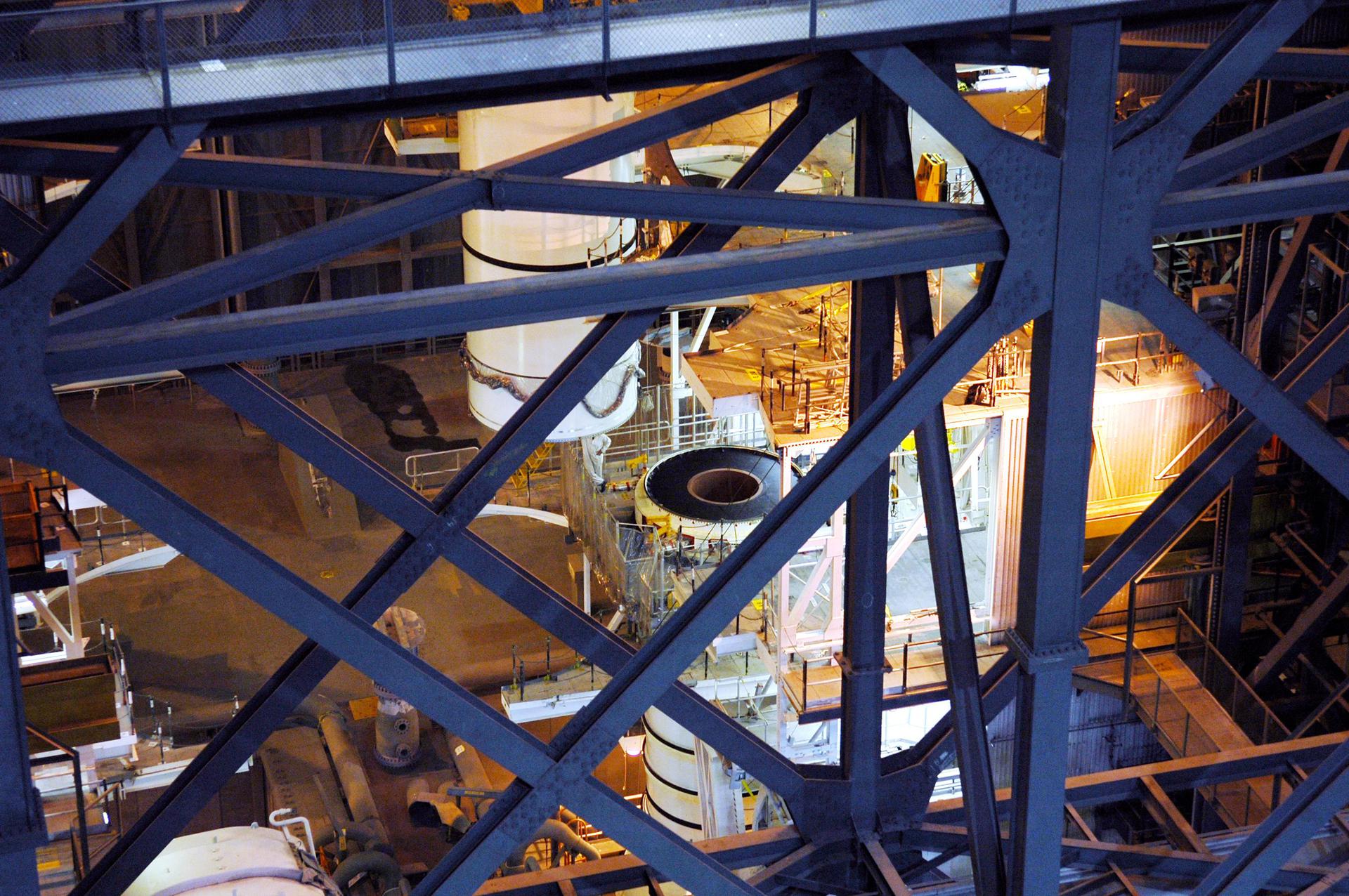 KENNEDY SPACE CENTER, FLA. - In the Vehicle Assembly Building (VAB), the right aft center segment of a Solid Rocket Booster (SRB) is lowered toward the aft booster for mating. The aft booster arrived in the VAB Nov. 22 for the Return to Flight mission STS-114. Two SRBs are stacked on the Mobile Launch Platform and later joined by the External Tank.. The twin 149-foot tall, 12-foot diameter SRBs provide the main propulsion system during launch. They operate parallel with the Space Shuttle main engines for the first two minutes of flight and jettison away from the orbiter with help from the Booster Separation Motors, about 26.3 nautical miles above the Earth’s surface.