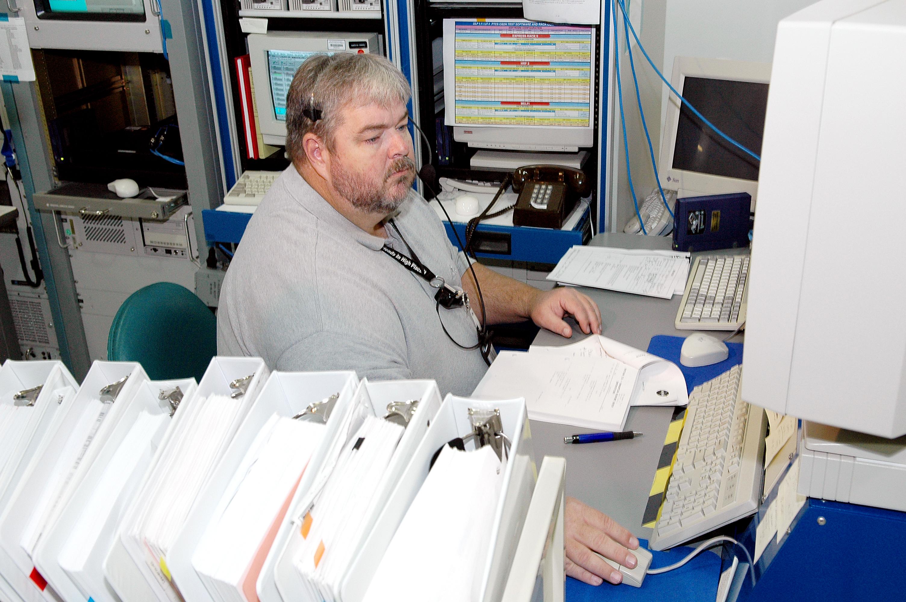 KENNEDY SPACE CENTER, FLA. - Joe Mounts, with Boeing, monitors the Payload Test and Checkout System for the Human Research Facility (HRF) Rack -2 payload. The HRF-2 is scheduled to fly on Return to Flight Space Shuttle mission STS-114. The HRF-2 will deliver additional biomedical instrumentation and research capability to the International Space Station. HRF Rack 1 contains an ultrasound unit and gas analyzer system and has been operational in the U.S. Lab since May 2001. HRF-2 will also be installed in the U. S. Lab and will provide structural, power, thermal, command and data handling, and communication and tracking interfaces between the HRF biomedical instrumentation and the U. S. Lab.