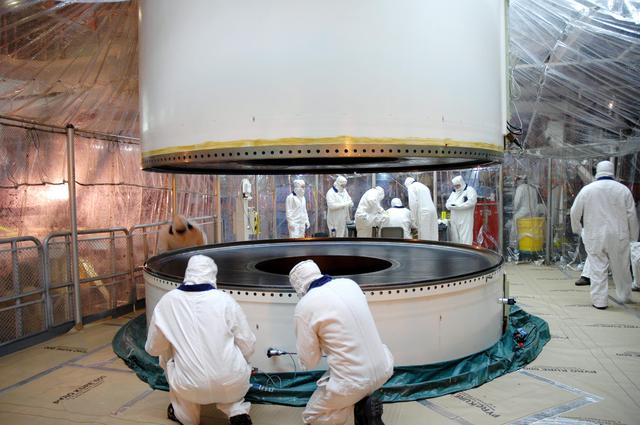 KENNEDY SPACE CENTER, FLA. - In a Vehicle Assembly Building (VAB) high bay, an aft center segment of a Solid Rocket Booster (SRB) is lowered toward an aft segment already secured to a Mobile Launch Platform. These segments are part of the right SRB for the Space Shuttle Return to Flight mission, STS-114. Two SRBs are stacked on a Mobile Launch Platform for each Shuttle flight and later joined by an External Tank. The twin 149-foot tall, 12-foot diameter SRBs provide the main propulsion system during launch. They operate in parallel with the Space Shuttle main engines for the first two minutes of flight and jettison away from the orbiter with help from the Booster Separation Motors, about 26.3 nautical miles above the Earth’s surface.