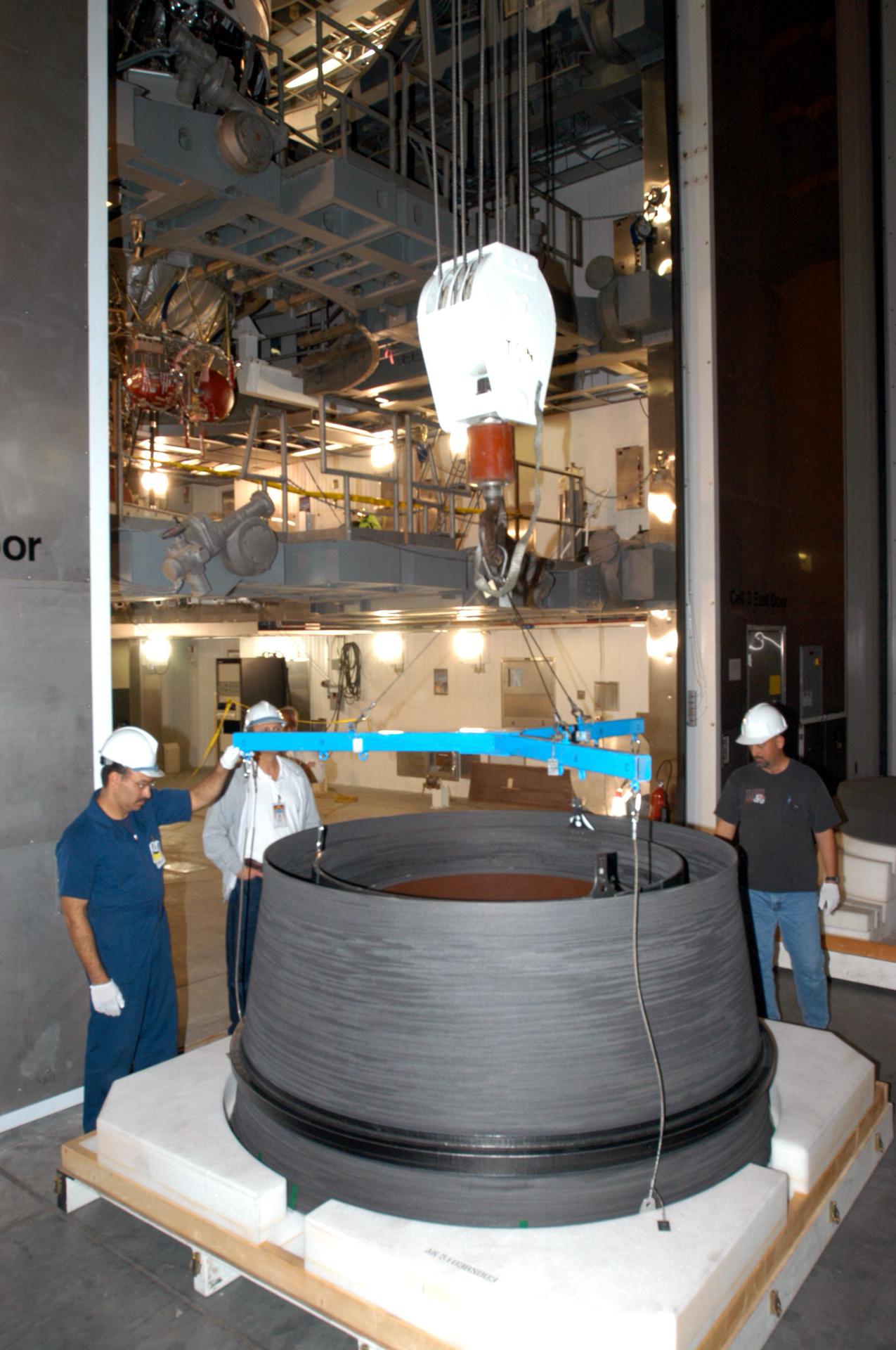 KENNEDY SPACE CENTER, FLA. - At the Delta Operations Center on Cape Canaveral Air Force Station, Fla., Wendell Perez checks an overhead crane being attached to the Delta second stage nozzle for a Boeing Delta IV launch vehicle. The nozzle is being lifted from its shipping container and moved to another site on the floor for inspection. The Delta IV is scheduled to launch the GOES-N satellite in May 2005. Geostationary Operational Environmental Satellites are sponsored by the National Aeronautics and Space Administration (NASA) and the National Oceanic and Atmospheric Administration (NOAA). GOES-N is the first in the next series of GOES satellites, N-P. The multimission GOES series N-P will be a vital contributor to weather, solar and space operations and science. The GOES N-P series will aid activities ranging from severe storm warnings to resource management and advances in science.