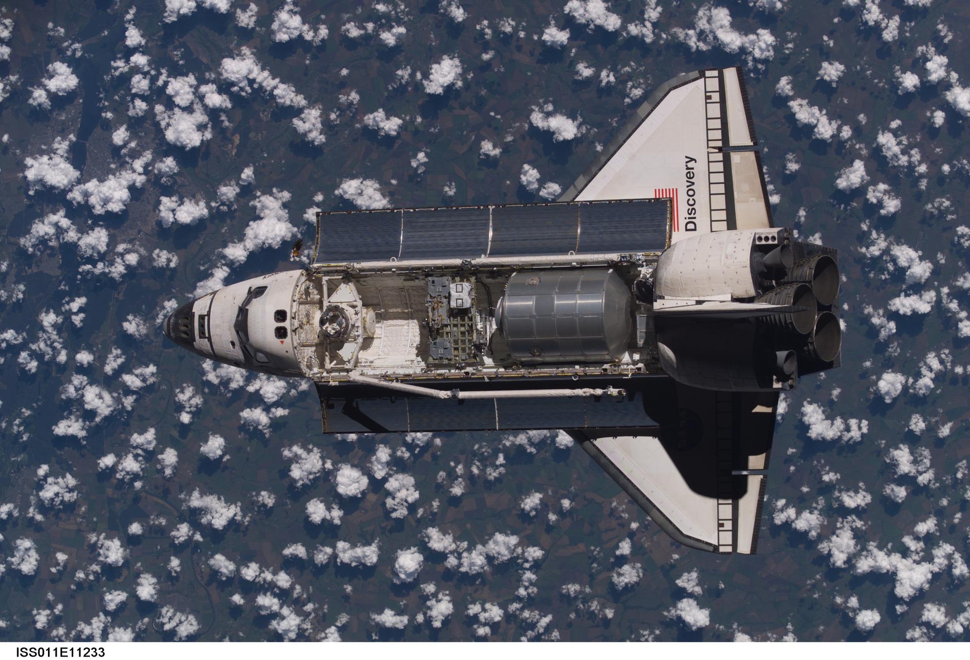 Launched on July 26, 2005 from the Kennedy Space Center in Florida, STS-114 was classified as Logistics Flight 1. Among the Station-related activities of the mission were the delivery of new supplies and the replacement of one of the orbital outpost's Control Moment Gyroscopes (CMGs). STS-114 also carried the Raffaello Multi-Purpose Logistics Module (MPLM) and the External Stowage Platform-2. Back dropped by popcorn-like clouds, the MPLM can be seen in the cargo bay as Discovery undergoes rendezvous and docking operations. Cosmonaut Sergei K. Kriklev, Expedition 11 Commander, and John L. Phillips, NASA Space Station officer and flight engineer photographed the spacecraft from the International Space Station (ISS).
