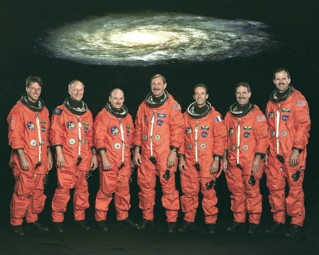 The STS-103 crew portrait includes (from left) C. Michael Foale, mission specialist; Claude Nicollier, mission specialist representing the European Space Agency (ESA) ; Scott J. Kelly, pilot; Curtis L. Brown, commander; and mission specialists Jean-Francois Clervoy (ESA), John M. Grunsfeld, and Steven L. Smith. Launched aboard the Space Shuttle Discovery on December 19, 1999 at 6:50 p.m. (CST), the STS-103 mission served as the third Hubble Space Telescope (HST) servicing mission.