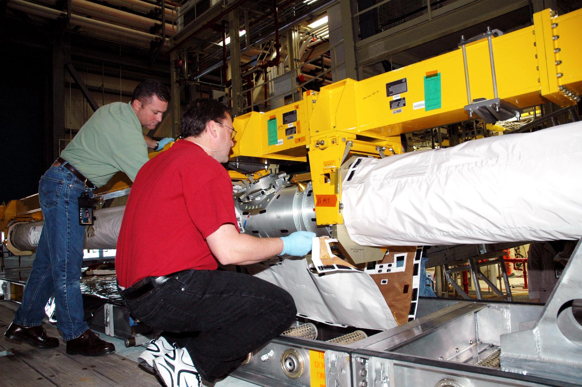 KENNEDY SPACE CENTER, FLA. - In the back transfer aisle of the Orbiter Processing Facility bay 3, Todd Dugan (right), a technician with United Space Alliance, lifts a Thermal Protection System (TPS) blanket onto an area of the Orbiter Boom Sensor System (OBSS). The installation will conclude TPS closeout prior to installation of the boom in the orbiter Discovery. The OBSS is one of the new safety measures for Return to Flight, equipping the Shuttle with cameras and laser systems to inspect the Shuttle’s Thermal Protection System while in space. Discovery is designated as the Return to Flight vehicle for mission STS-114, with a launch window of May 12 to June 3, 2005.