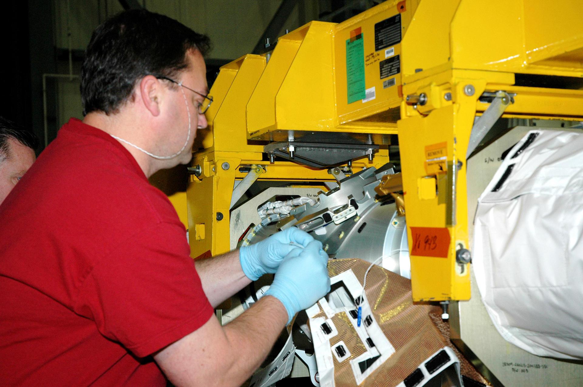 KENNEDY SPACE CENTER, FLA. - In the back transfer aisle of the Orbiter Processing Facility bay 3, Todd Dugan, a technician with United Space Alliance, begins attaching the Thermal Protection System (TPS) blanket to the Orbiter Boom Sensor System (OBSS). The installation of the insulation concludes TPS closeout prior to installation of the boom in the orbiter Discovery. The OBSS is one of the new safety measures for Return to Flight, equipping the Shuttle with cameras and laser systems to inspect the Shuttle’s Thermal Protection System while in space. Discovery is designated as the Return to Flight vehicle for mission STS-114, with a launch window of May 12 to June 3, 2005.