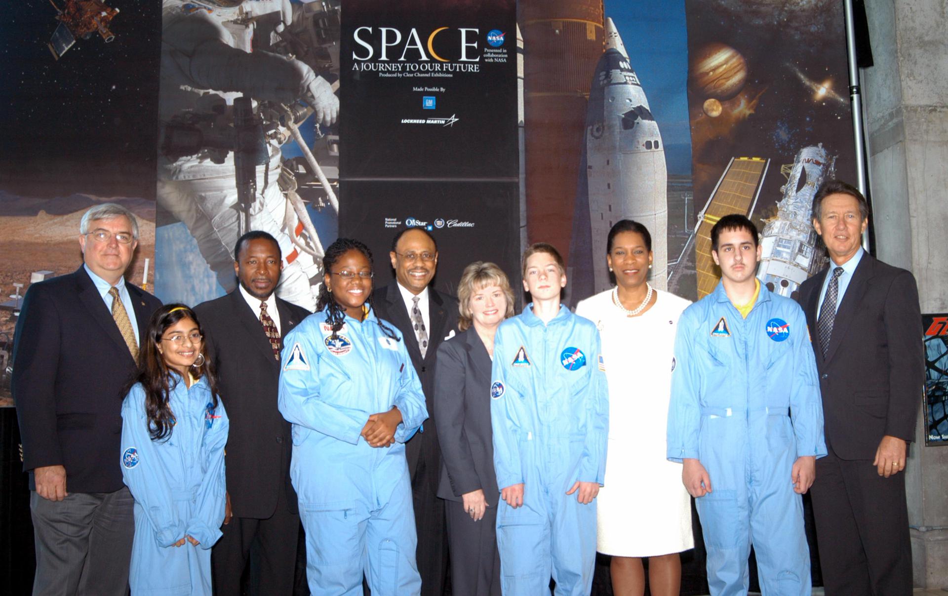 KENNEDY SPACE CENTER, FLA. - Students from one of NASA’s Explorer Schools, Stewart Middle School in Tampa pose for a photo with other guests visiting the Museum of Science and Industry (MOSI) in Tampa. At left, in the back row, are former astronaut Dan Brandenstein, current vice president of Consolidated Space Operations Centers (CSOC), and KSC Deputy Director Dr. Woodrow Whitlow Jr. In the center is Ronte Smith, southeast regional sales manager for General Motors, and Gail Rymer, with Lockheed Martin. On the right are Dr. Adena Williams Loston, chief education officer at NASA Headquarters, and Wit Ostrenko, president of MOSI. The MOSI is featuring the space exhibits Space: A Journey to Our Future, an extraordinary, interactive exhibition designed to entertain, educate and inspire; and SPACE STATION, the first cinematic journey to the International Space Station (ISS), where audiences can experience for themselves life in zero gravity aboard the new station.