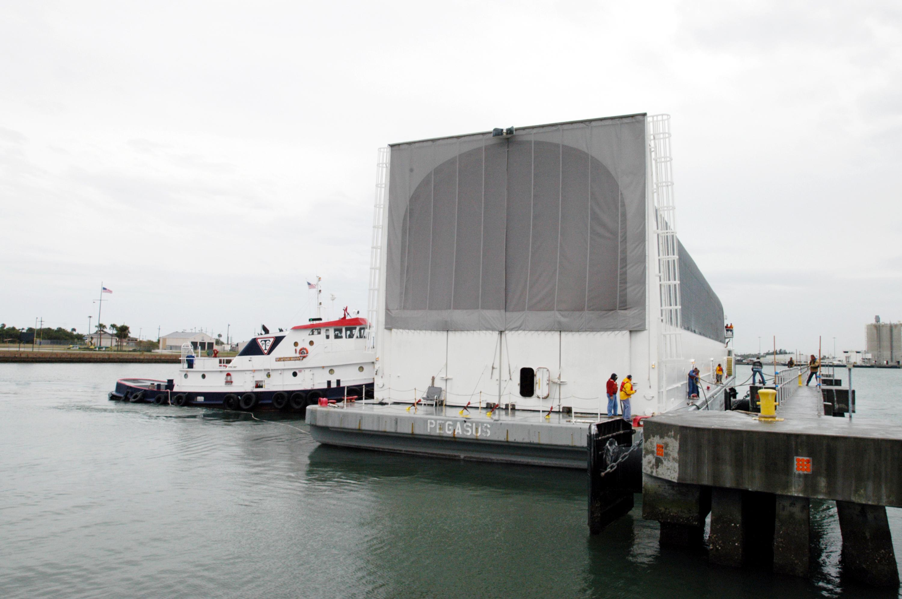 KENNEDY SPACE CENTER, FLA. - At Port Canaveral, a tug maneuvers the barge carrying a newly redesigned External Tank (ET-121) toward the dock. The tank is designated for use on Return to Flight mission STS-121. The barge was towed on a 900-mile journey at sea from the Michoud Assembly Facility in New Orleans by NASA’s Solid Rocket Booster Retrieval Ship Freedom Star. At Port Canaveral, the barge will be hooked up to tugs for the last part of the journey to the Launch Complex 39 Area Turn Basin at NASA’s Kennedy Space Center. It will then be offloaded and transported to the Vehicle Assembly Building.