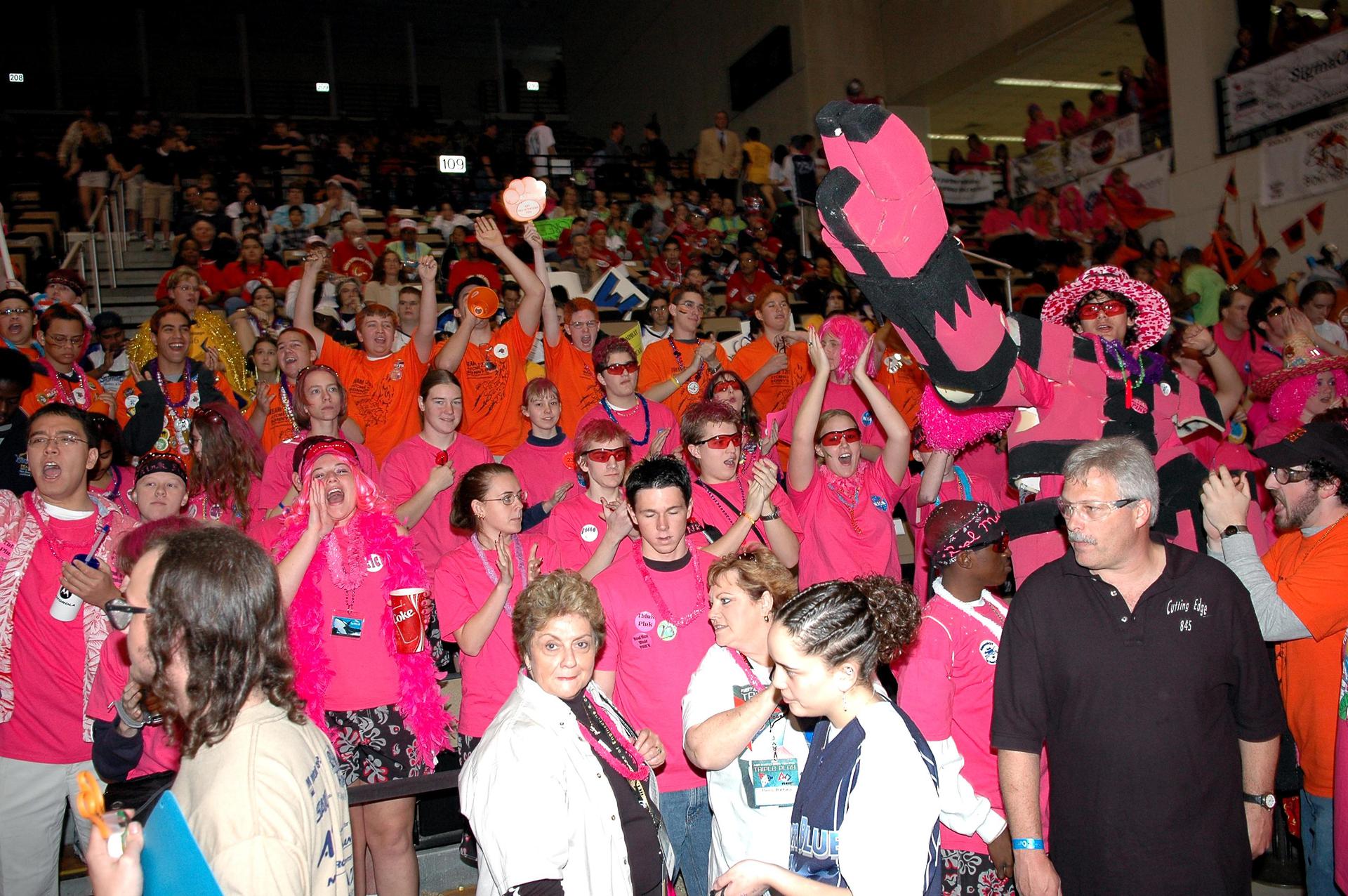 KENNEDY SPACE CENTER, FLA. - Pink T-shirt-clad friends and family cheer for the Space Coast FIRST Robotics Team, known as the Pink Team, at the 2005 FIRST Robotics Regional Competition held at the University of Central Florida March 10-12. The NASA-sponsored Roccobots took first place in the competition as part of a three-team alliance and advances to the Championship in Atlanta in April. The Pink Team comprises students from Rockledge High School and Cocoa Beach Junior_Senior High School.