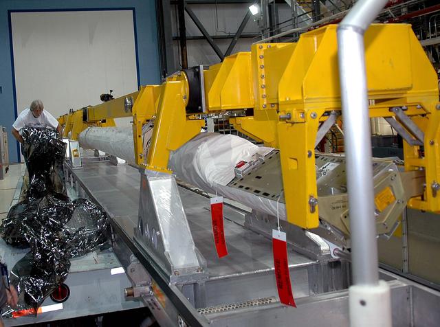 KENNEDY SPACE CENTER, FLA. - In the Orbiter Processing Facility bay 1 at NASA’s Kennedy Space Center, a worker rolls the plastic cover removed from the Orbital Boom Sensor System (OBSS), at right, which will be installed in the payload bay of Atlantis. The 50-foot-long OBSS attaches to the Remote Manipulator System, or Shuttle robotic arm, and is one of the new safety measures for Return to Flight, equipping the orbiter with cameras and laser systems to inspect the Shuttle’s Thermal Protection System while in space. The Return to Flight mission STS-121 has a launch window of July 12 - July 31, 2005.