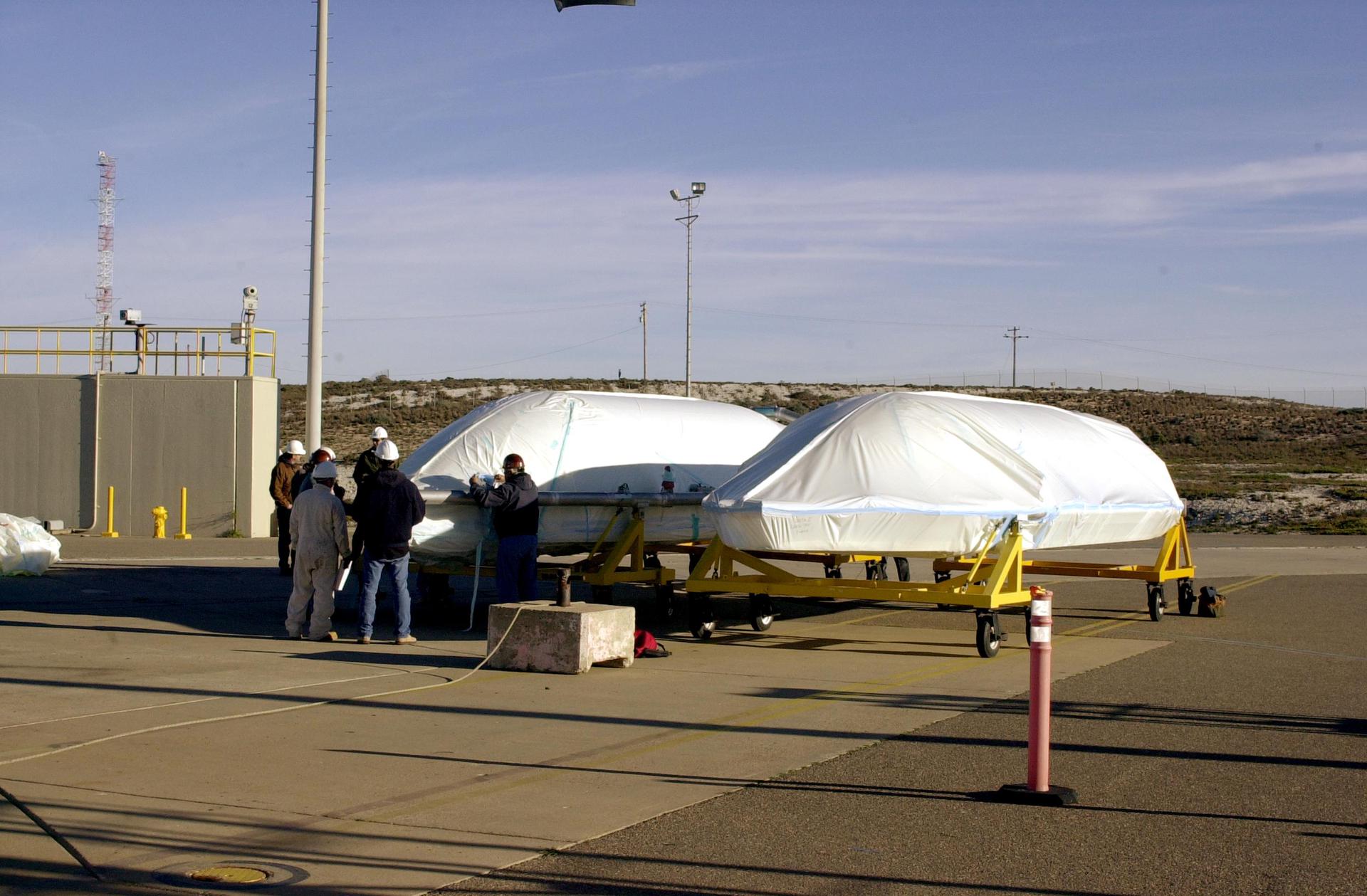 VANDENBERG AIR FORCE BASE, CALIF. - On Space Launch Complex 2 at Vandenberg Air Force Base in California, the two fairing sections for the National Oceanic and Atmospheric Administration (NOAA-N) spacecraft are ready to be lifted up the launch service tower. The fairing is placed around the spacecraft to protect it during launch. NOAA-N is the fourth in the series of support dedicated microwave instruments for the generation of temperature, moisture, surface, and hydrological products in cloudy regions where visible and infrared (IR) instruments have decreased capability. Launch aboard a Boeing Delta II rocket is currently scheduled for no earlier than May 11, 2005.