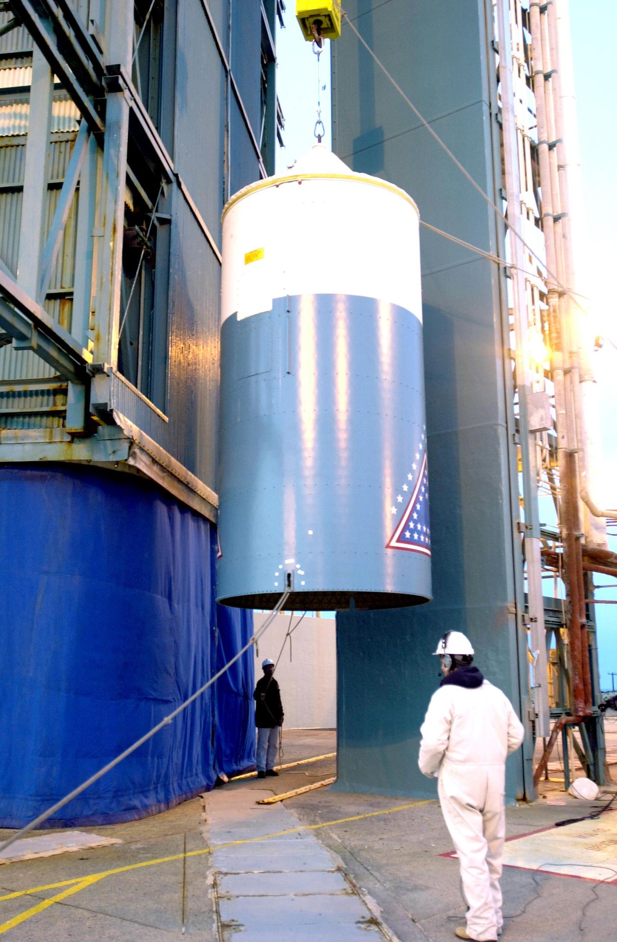 VANDENBERG AIR FORCE BASE, CALIF. - - The interstage of a Boeing Delta 2 rocket is lifted up the launch service tower on Space Launch Complex 2 at Vandenberg Air Force Base in California. It will be mated with the first stage in the launch service tower. The Delta 2 is the launch vehicle for the National Oceanic and Atmospheric Administration (NOAA-N) spacecraft. NOAA-N is the fourth in the series of support dedicated microwave instruments for the generation of temperature, moisture, surface, and hydrological products in cloudy regions where visible and infrared (IR) instruments have decreased capability. Launch aboard a Boeing Delta II rocket is currently scheduled for no earlier than May 11, 2005.
