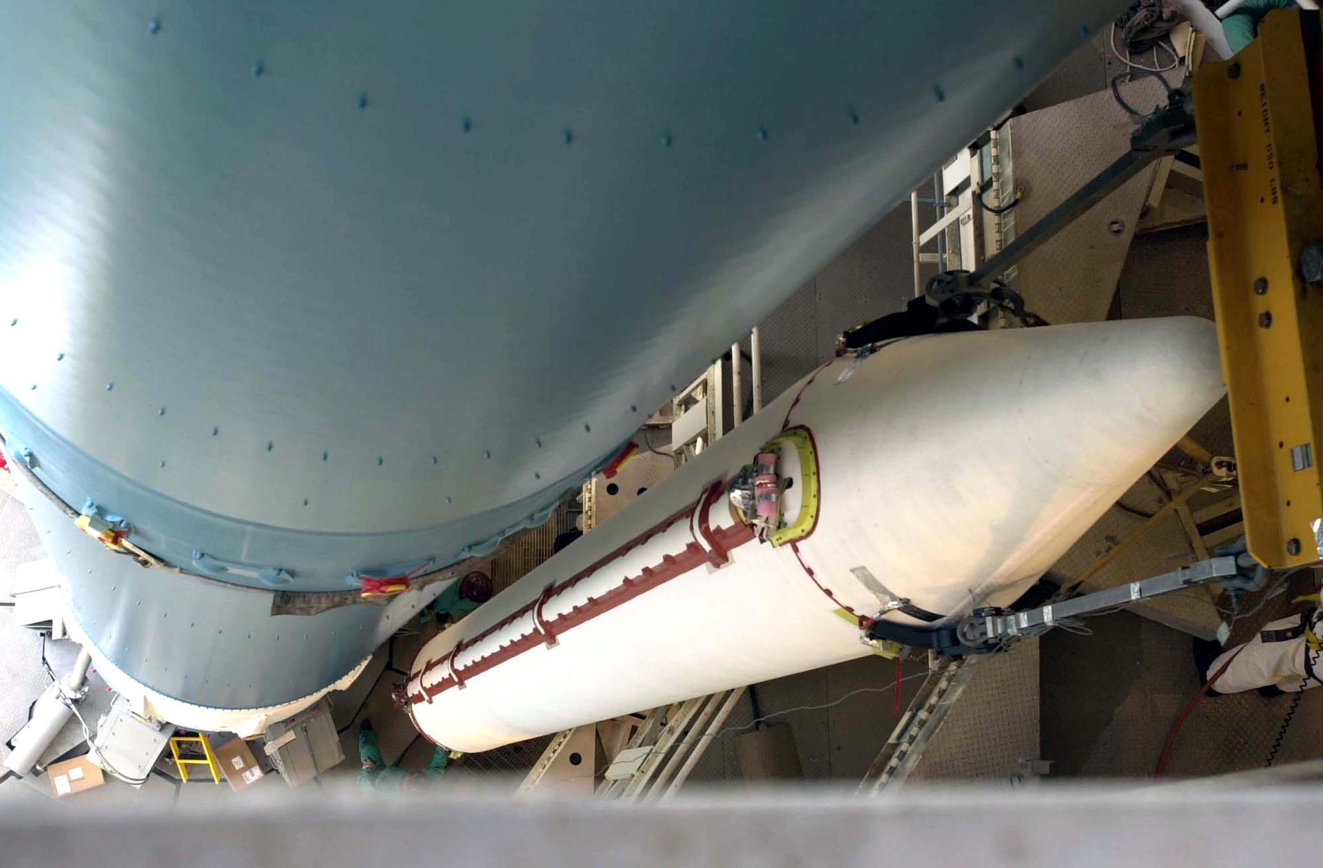 VANDENBERG AIR FORCE BASE, CALIF. - At Space Launch Complex 2 on Vandenberg Air Force Base in California, one of three Solid Rocket Boosters is lifted alongside the first stage of a Boeing Delta II rocket for mating. The Boeing Delta II will launch the National Oceanic and Atmospheric Administration (NOAA-N) spacecraft. Launch of NOAA-N aboard the Boeing Delta II rocket is currently scheduled for May 11, 2005. NOAA-N is the fourth in the series of support dedicated microwave instruments for the generation of temperature, moisture, surface, and hydrological products in cloudy regions where visible and infrared (IR) instruments have decreased capability.