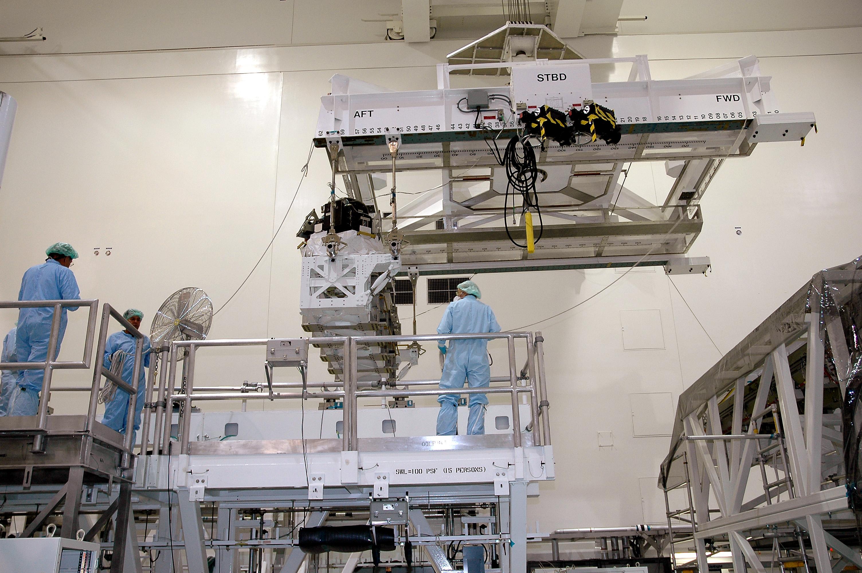 KENNEDY SPACE CENTER, FLA. - In the Space Station Processing Facility, the Cargo Element Lifting Assembly (CELA) carries the Lightweight Multi-Purpose Experiment Support Structure Carrier (LMC) closer to the Payload Transportation Canister. The LMC is being installed in the canister in preparation for transfer to Launch Pad 39B. The LMC will deliver a replacement Control Moment Gyroscope (CMG) and the Detailed Test Objective (DTO) tile sample repair kit to the International Space Station on Discovery’s Return to Flight mission STS-114.