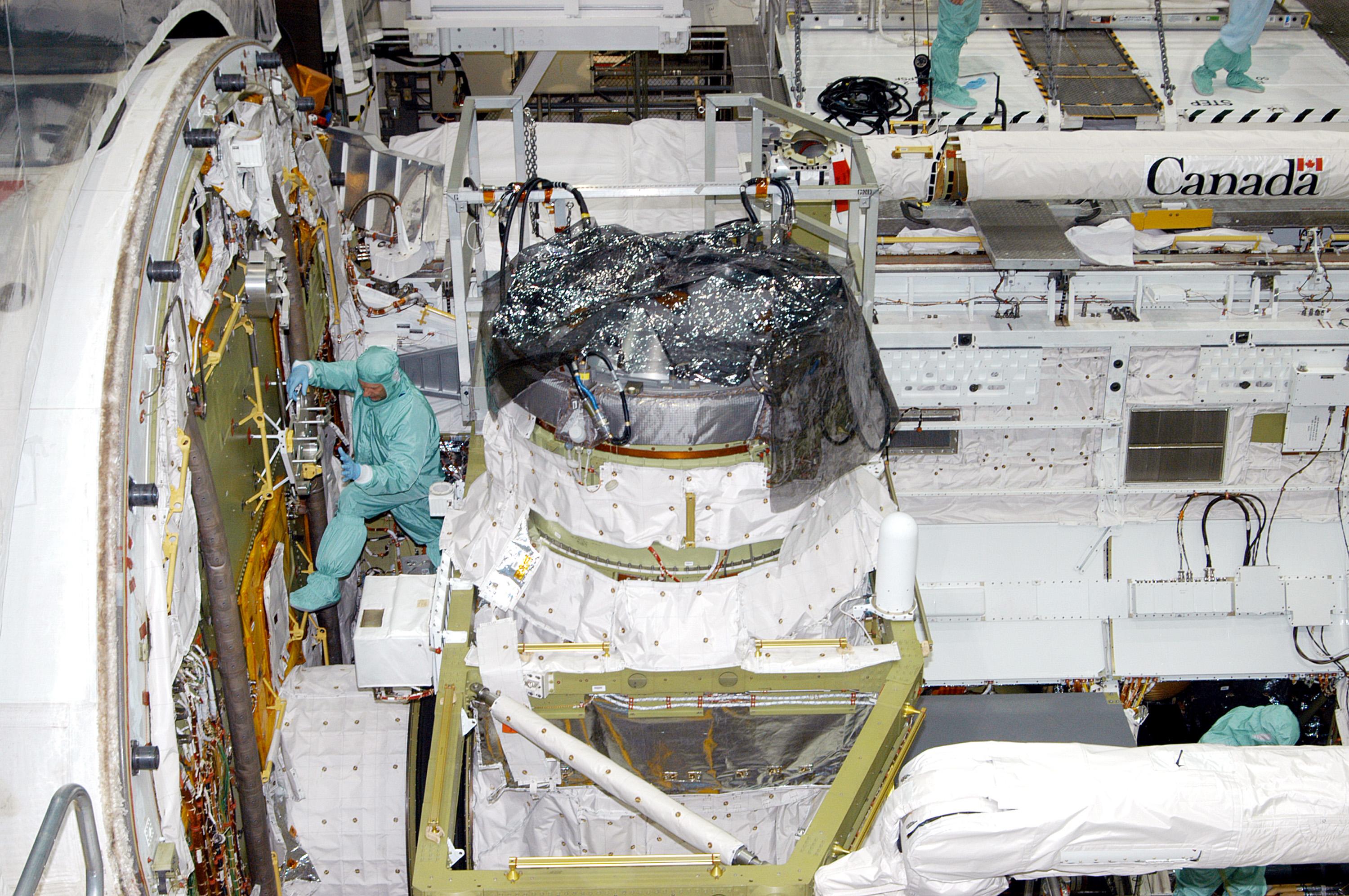 KENNEDY SPACE CENTER, FLA. - During Crew Equipment Interface Test (CEIT) in the Orbiter Processing Facility at NASA’s Kennedy Space Center, STS-121 Mission Specialist Michael E. Fossum familiarizes himself with the Portable Foot Restraint on the forward bulkhead of Atlantis. The Airlock is in the center. During CEIT, the crew has an opportunity to get a hands-on look at the orbiter and equipment they will be working with on their mission. Mission STS-121 is scheduled to launch aboard Space Shuttle Atlantis in July.