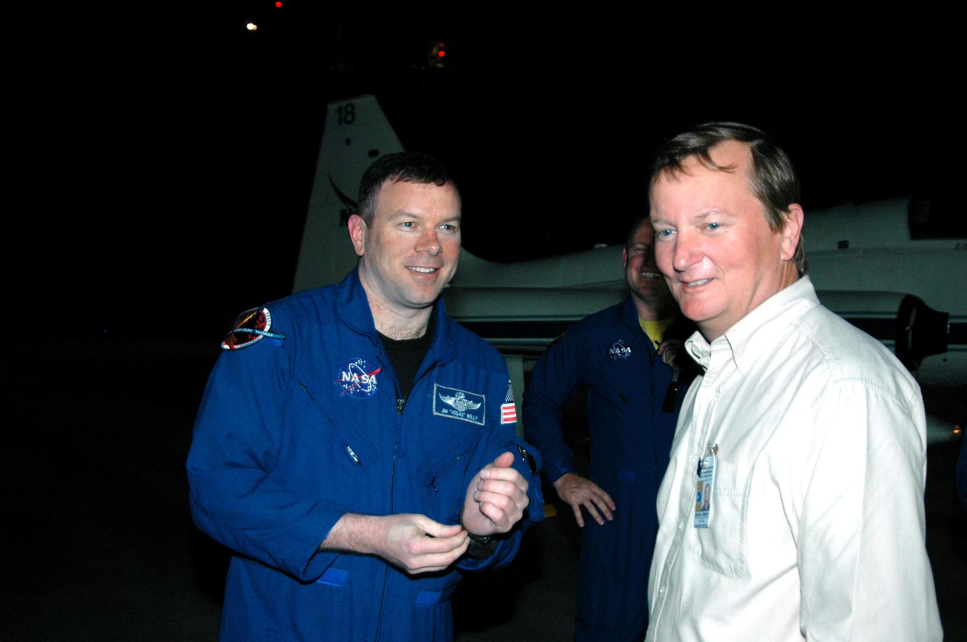 KENNEDY SPACE CENTER, FLA. - At Kennedy Space Center’s Shuttle Landing Facility, STS-114 Pilot James Kelly (left) is greeted by Shuttle Launch Director Mike Leinbach. Kelly and other crew members are taking part in the Terminal Countdown Demonstration Test (TCDT) over the next three days. The TCDT is held at KSC prior to each Space Shuttle flight. It provides the crew of each mission an opportunity to participate in simulated countdown activities. The test ends with a mock launch countdown culminating in a simulated main engine cutoff. The crew also spends time undergoing emergency egress training exercises at the launch pad. This is Kelly’s second space flight. STS-114 is the first Return to Flight mission to the International Space Station. The launch window extends July 13 through July 31.