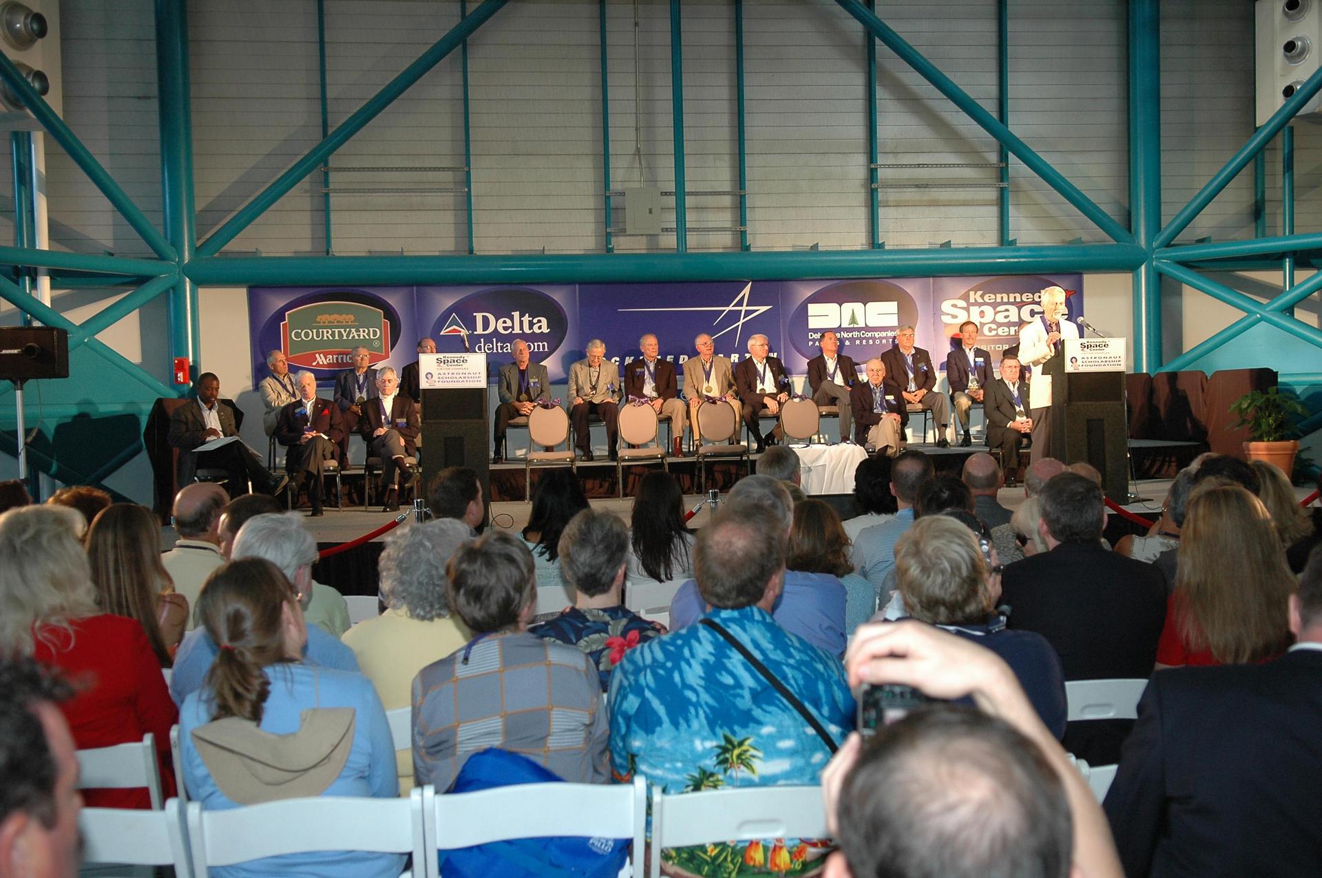 KENNEDY SPACE CENTER, FLA. - Owen Garriott, chairman of the Astronaut Hall of Fame, speaks to guests at the Induction Ceremony of three new additions to the Hall of Fame: Gordon Fullerton, Bruce McCandless and Joe Allen. Seated on stage are current Hall of Famers, from left in the back row, Dick Gordon, Walt Cunningham, Bill Anders, Ed Mitchell, Al Worden, Charles Duke, Jack Lousma, Bill Pogue, Robert Crippen, Dan Brandenstein, Robert “Hoot” Gibson and Stephen Covey. In front, from left, are Master of Ceremonies LeVar Burton, who starred in the television series “Star Trek: The Next Generation,” and Hall of Famers Scott Carpenter and John Young, and at right, Jim Lovell and Fred Haise. The ceremony is being held in the Kennedy Space Center Visitor Complex’s Apollo_Saturn V Center. Recognized for their individual flight accomplishments and contributions to the success and future success of the U.S. space program, this elite group of inductees is among only 60 astronauts to be honored in the Hall of Fame and the fourth group of Space Shuttle astronauts named.