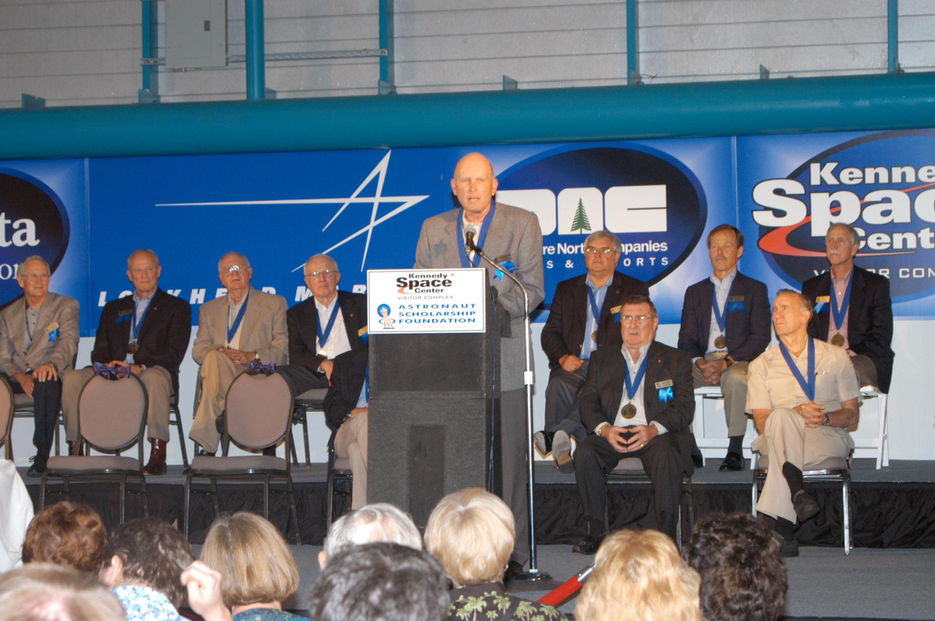 KENNEDY SPACE CENTER, FLA. - At the Astronaut Hall of Fame Induction Ceremony, new inductee Gordon Fullerton addresses guests. Behind him are current Hall of Famers (from left, back row) Al Worden, Charles Duke, Jack Lousma, Bill Pogue, Dan Brandenstein, Robert “Hoot” Gibson and Stephen Covey; (in front row) Fred Haise and Vance Brand. The other new inductees are Bruce McCandless and Joe Allen. The event is being held in the Kennedy Space Center Visitor Complex’s Apollo_Saturn V Center. Recognized for their individual flight accomplishments and contributions to the success and future success of the U.S. space program, this elite group of inductees is among only 60 astronauts to be honored in the Hall of Fame and the fourth group of Space Shuttle astronauts named.