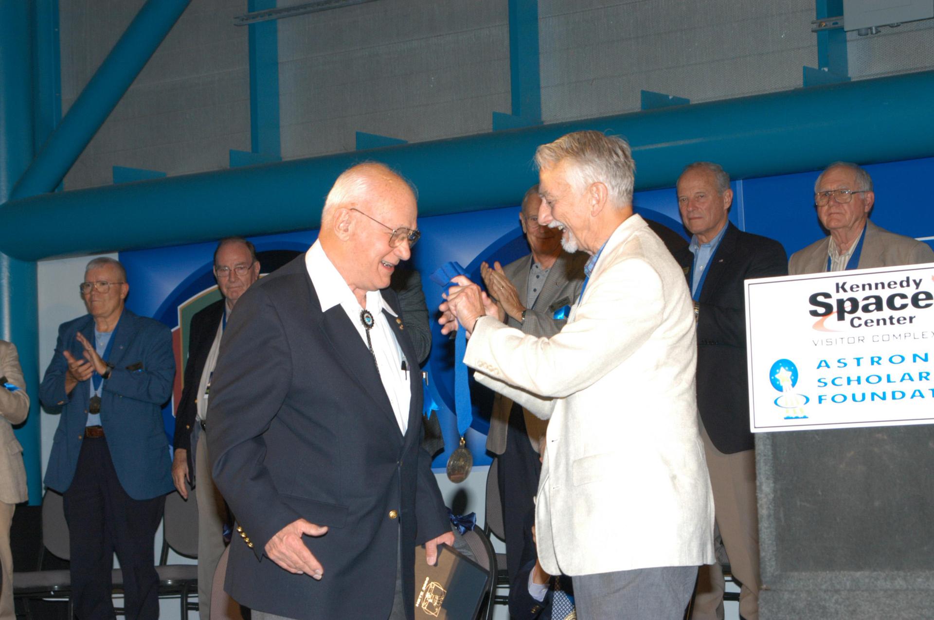 KENNEDY SPACE CENTER, FLA. - At the Astronaut Hall of Fame Induction Ceremony, new inductee Bruce McCandless (left) receives the medal from Chairman Owen Garriott. Seen behind them are current Hall of Famers Walt Cunningham and Bill Anders (at left), Al Worden (center), and Charlie Duke and Jack Lousma. The other new inductees are Joe Allen and Gordon Fullerton. The event is being held in the Kennedy Space Center Visitor Complex’s Apollo_Saturn V Center. Recognized for their individual flight accomplishments and contributions to the success and future success of the U.S. space program, this elite group of inductees is among only 60 astronauts to be honored in the Hall of Fame and the fourth group of Space Shuttle astronauts named.