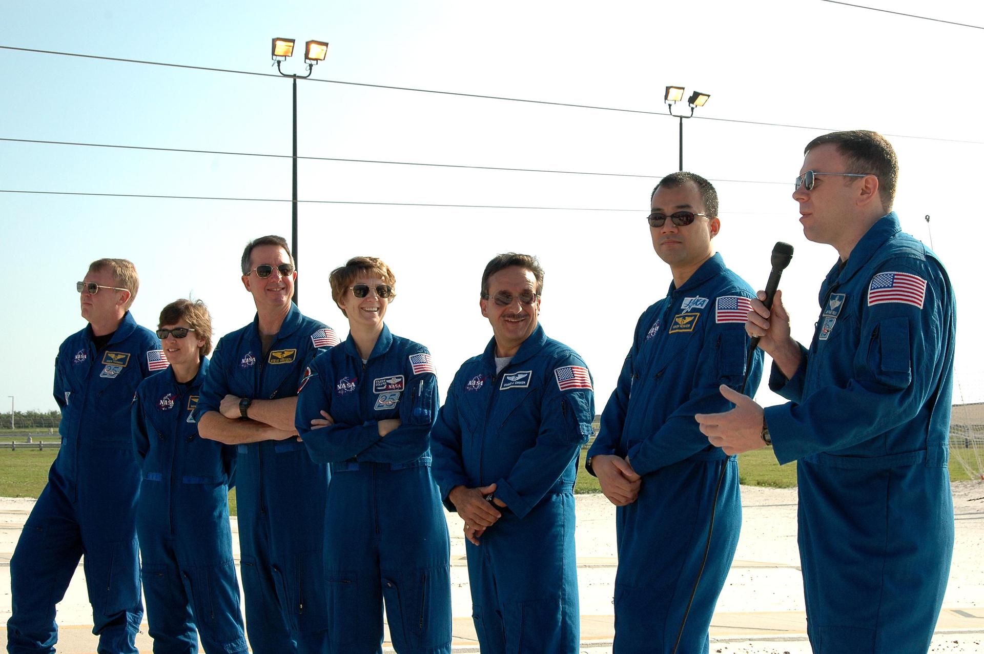 KENNEDY SPACE CENTER, FLA. - The STS-114 crew gathers for media questions at the slidewire basket landing area on Launch Pad 39B. Pilot James Kelly (far right) responds to a question. The other crew members are, from left, Mission Specialists Andrew Thomas, Wendy Lawrence and Stephen Robinson, Commander Eileen Collins, and Mission Specialists Charles Camarda and Soichi Noguchi, who is with the Japan Aerospace Exploration Agency. The TCDT is held at KSC prior to each Space Shuttle flight. It provides the crew of each mission an opportunity to participate in simulated countdown activities. The test ends with a mock launch countdown culminating in a simulated main engine cutoff. The crew also spends time undergoing emergency egress training exercises at the launch pad. STS-114 is designated the first Return to Flight mission, with a launch window extending from July 13 to July 31.