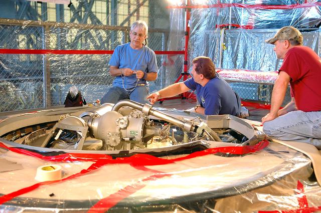 KENNEDY SPACE CENTER, FLA. - In the Vehicle Assembly Building, Michael Cinquigianno (left), who is a system test mechanical technician with Lockheed Martin, checks out the vent valve assembly on External Tank 121. Next to him is Lance Mercier, with Lockheed Martin Quality Control. The assembly sits on top of the tank and, when on the launch pad, is connected to the “beanie cap,” a swing-arm-mounted cap that covers the oxygen tank vent on top of the tank during the countdown. The cap is retracted about two minutes before liftoff. The cap siphons off oxygen vapor that threatens to form large ice on the tank, thus protecting the orbiter’s thermal protection system during launch. The External Tanks are built by Lockheed Martin at the Michoud Assembly Facility near New Orleans. The tank is being prepared to fly with Discovery on mission STS-114, whose launch window extends July 13 to July 31.