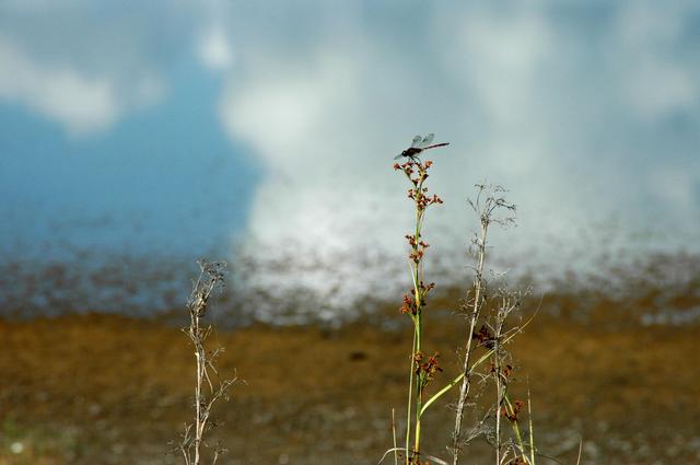 KENNEDY SPACE CENTER, FLA. - A dragonfly rests atop the highest stalk in foliage on the Merritt Island National Wildlife Refuge before resuming its daily activity. Large predatory insects with wingspans up to 5.5 inches, dragonflies snatch smaller insects from the air by means of their basket-like arrangement of legs. The refuge was established in 1963 on Kennedy Space Center land and water not used by NASA for the space program. It encompasses 92,000 acres that are a habitat for more than 331 species of birds, 31 mammals, 117 fishes, and 65 amphibians and reptiles.
