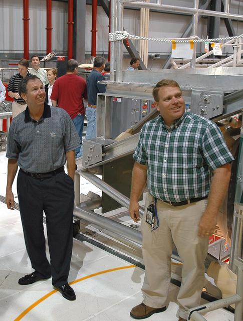 KENNEDY SPACE CENTER, FLA. - NASA Administrator Michael Griffin (left) tours Orbiter Processing Facility bay 1 where Space Shuttle Atlantis is currently being processed for the second Return to Flight mission, STS-121. He is accompanied by NASA ground systems engineer Doug Moore. This is Griffin's first official visit to Kennedy Space Center. Griffin is the 11th administrator of NASA, a role he assumed on April 14, 2005. Griffin was nominated to the position in March while serving as the Space Department head at Johns Hopkins University's Applied Physics Laboratory in Baltimore. A registered professional engineer in Maryland and California, Griffin served as chief engineer at NASA earlier in his career. He holds numerous scientific and technical degrees including a Ph.D. in Aerospace Engineering from the University of Maryland.