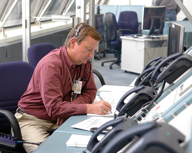 KENNEDY SPACE CENTER, FLA. - Space Shuttle launch director Michael Leinbach supports an External Tank (ET) tanking test at Launch Pad 39B from the Launch Control Center. The tanking test is designed to evaluate how the tank, orbiter, solid rocket boosters and ground systems perform under 'cryo-load,' when the tank is filled with the two ultra-low-temperature propellants. The tank filling and draining portion of the test takes about 11 hours. The test also includes a simulated countdown through the hold at T-31 seconds. The test is being conducted to troubleshoot two issues identified by a tanking test held on April 14. Data is being collected to analyze the liquid hydrogen sensors that gave intermittent readings and the liquid hydrogen pressurization relief valve that cycled more times than standard. The tanking tests are part of preparations for Space Shuttle Discovery's Return to Flight mission, STS-114, to the International Space Station. The launch window extends from July 13 through July 31.