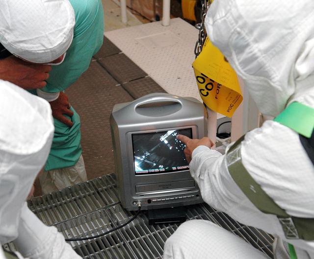 KENNEDY SPACE CENTER, FLA. - At Launch Complex 39B, technicians in Space Shuttle Discovery's payload bay monitor the images received during a borescope inspection of the retract link assembly on the orbiter's main landing gear door. The inspection is a precautionary measure after a small crack was found in a retract link assembly on the right-hand main landing gear on orbiter Atlantis. An initial review of the closeout photos of the link assembly on Discovery did not reveal any cracks. Discovery is scheduled to return the Space Shuttle fleet to operational status on mission STS-114. This additional work does not impact the launch planning window of July 13-31.