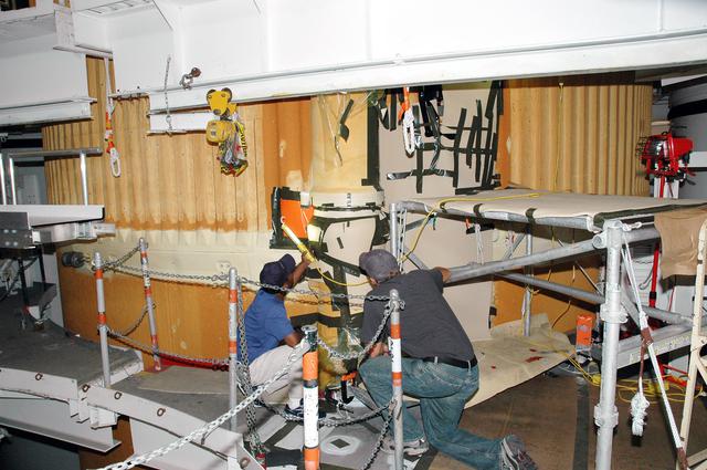 KENNEDY SPACE CENTER, FLA. - In the Vehicle Assembly Building at NASA’s Kennedy Space Center, workers inspect the newly installed liquid hydrogen bellows heater on External Tank 121. The new heater has been added to the feedline bellows to minimize the potential for ice and frost buildup. The tank has been designated to fly on Discovery for Return to Flight mission STS-114, which has a launch window extending from July 13 to July 31.