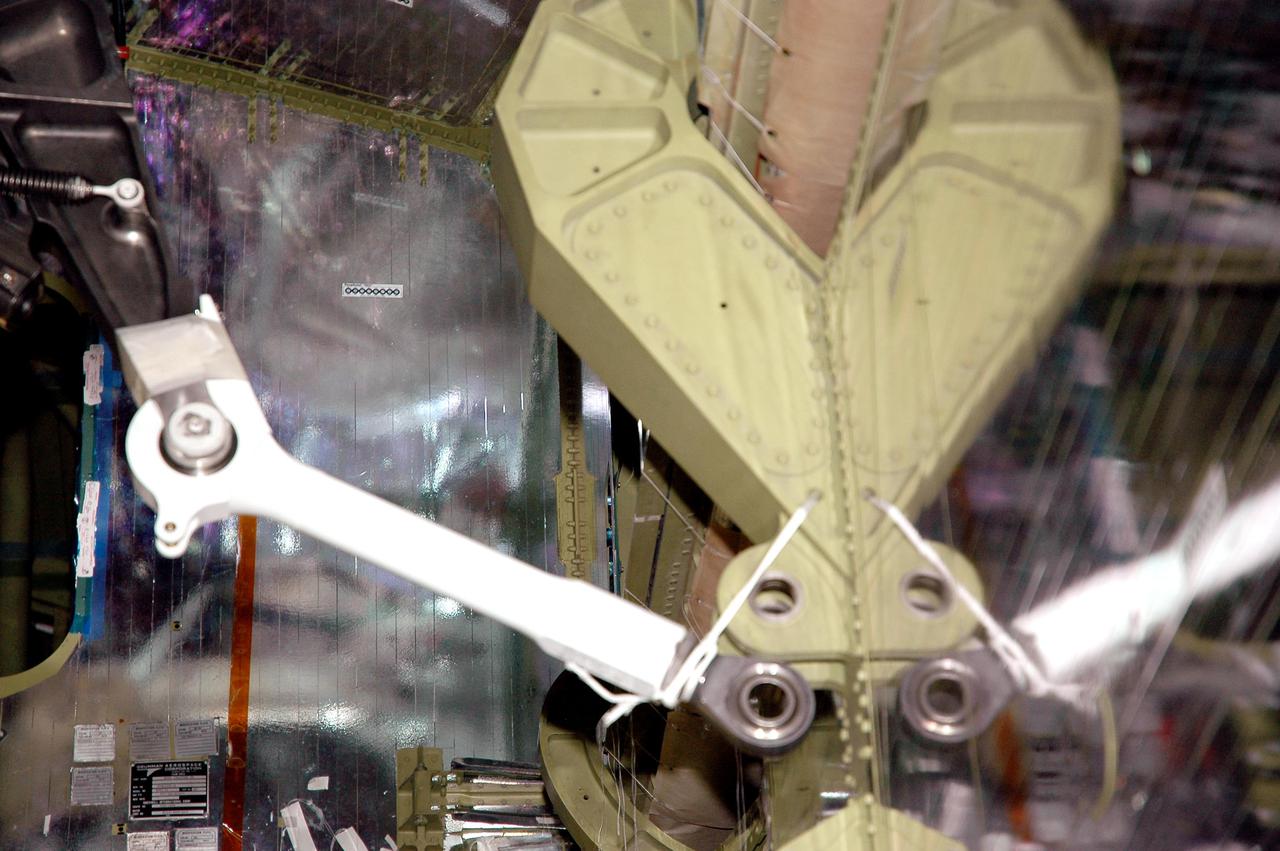 KENNEDY SPACE CENTER, FLA. - In the Orbiter Processing Facility at NASA’s Kennedy Space Center, a replacement retract link (left) is being installed because a small crack was found recently on the retract link assembly. One end of the link is tethered until it is attached. At right is a blurred reflection on a plastic barrier. To lower the main landing gear, a mechanical linkage released by each gear actuates the doors to the open position. The landing gear reach the full-down and extended position with 10 seconds and are locked in the down position by spring-loaded downlock bungees Atlantis is scheduled to launch in September 2005 on the second Return to Flight mission, STS-121.