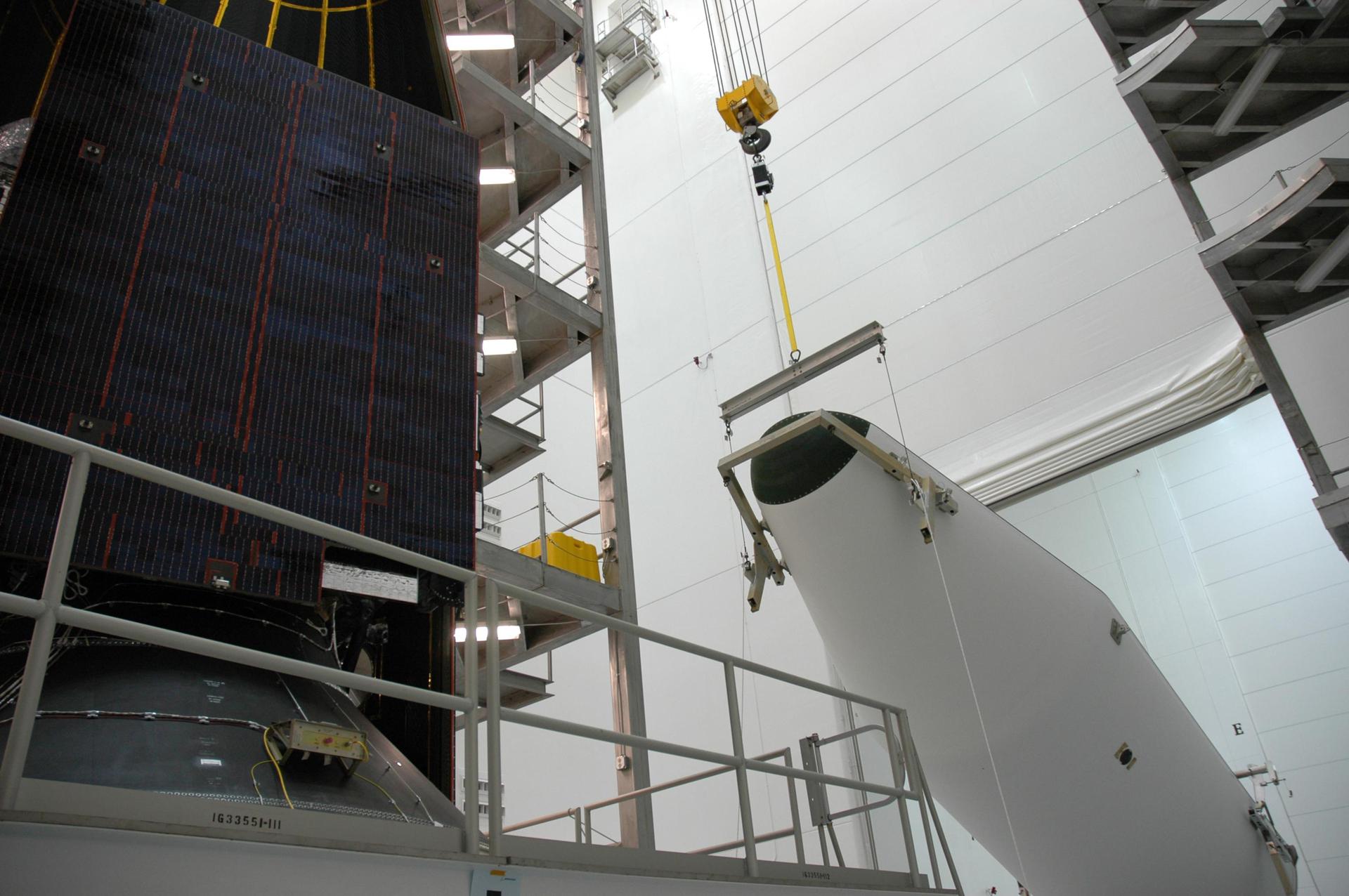 KENNEDY SPACE CENTER, FLA. - At Astrotech Space Operations in Titusville, Fla., the second half of the fairing is lifted in order to install it around the GOES-N spacecraft (center). The fairing protects the spacecraft during launch. Geostationary Operational Environmental Satellites (GOES) are sponsored by NASA’s Goddard Space Flight Center and the National Oceanic and Atmospheric Administration. GOES-N is targeted to launch June 23 from Launch Complex 37 at Cape Canaveral Air Force Station in Florida.