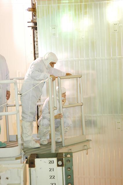 KENNEDY SPACE CENTER, FLA. - At Launch Pad 39B, Mission Specialists Charles Camarda (left) and Wendy Lawrence take a final look at the payloads in Space Shuttle Discovery's cargo bay before launch. During its 12-day mission, Discovery’s seven-person crew will test new hardware and techniques to improve Shuttle safety, as well as deliver supplies to the International Space Station. Discovery’s payloads include the Multi-Purpose Logistics Module Raffaello, the Lightweight Multi-Purpose Experiment Support Structure Carrier (LMC), and the External Stowage Platform-2 (ESP-2). Raffaello will deliver supplies to the International Space Station including food, clothing and research equipment. The LMC will carry a replacement Control Moment Gyroscope and a tile repair sample box. The ESP-2 is outfitted with replacement parts. Launch of Discovery on its Return to Flight mission STS-114 is set for July 13.