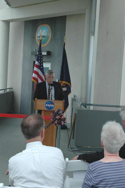 KENNEDY SPACE CENTER, FLA. - At the Shuttle Landing Facility on NASA’s Kennedy Space Center, KSC Director Jim Kennedy talks to attendees at the ribbon-cutting ceremony for the new NASA Air Traffic Control Tower. The dedication took place in the SLF’s new media facilities, which were built for the Return to Flight mission STS-114 and the landing of Shuttle Discovery. The facilities are co-located with the new control tower. The dedication and ribbon cutting were held at the base of the tower and included Center Director Jim Kennedy, Space Gateway Support President William A. Sample, External Relations Director Lisa Malone, Center Operations Director Scott D. Kerr, and KSC Safety Aviation Officer Albert E. Taff. The structure rises 110 feet over the midpoint of the runway and offers air traffic controllers a magnificent 360-degree view of Kennedy Space Center, Cape Canaveral Air Force Station and north Brevard County. It replaces the small, portable tower installed at the edge of the runway in 1986. The new control tower will manage all landings and departures from the SLF, including air traffic within the Kennedy Space Center-Cape Canaveral restricted airspace. The facility provides a 24-hour weather-observing facility providing official hourly weather observations for the SLF and the Cape Canaveral vicinity, including special observations for all launches and landings. State-of-the-art, weather-observing equipment has been installed for Space Shuttle landings and for serving conventional aircraft landing at the SLF. At this location, weather observers will have a multi-directional view of the weather conditions at the runway and Launch Complex 39.