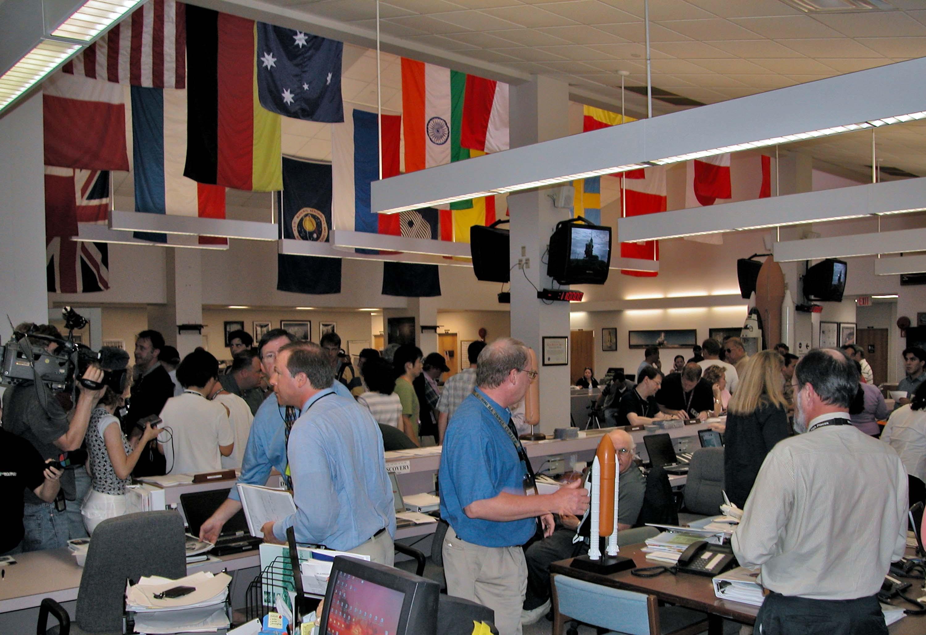 KENNEDY SPACE CENTER, FLA. - NASA spokesmen prepare to answer questions from news media representatives gathered in the NASA Newsroom to cover the countdown for the launch of Space Shuttle Discovery on Return to Flight mission STS-114. Liftoff is planned for 3:51 p.m. EDT July 13. During its 12-day mission, Discovery’s seven-person crew will test new hardware and techniques to improve Shuttle safety, as well as deliver supplies to the International Space Station.