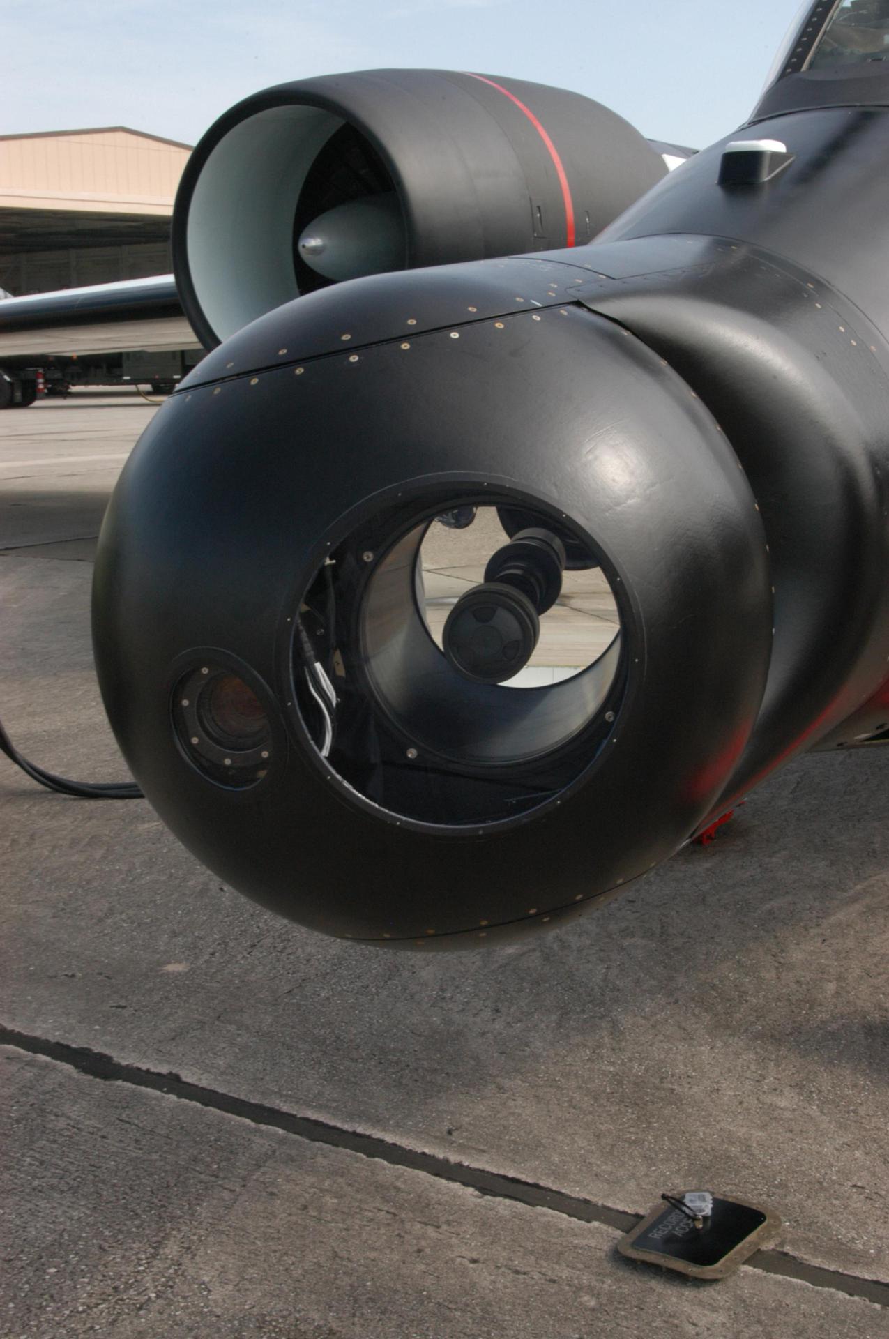KENNEDY SPACE CENTER, FLA. - This view shows the 32-inch-ball turret system mounted on the nose of a WB-57 aircraft at Patrick Air Force Base in Cocoa Beach, Fla. It houses an optical bench, providing installation of both HDTV and infrared cameras as part of the NASA-approved WB-57 Ascent Video Experiment (WAVE). Flown during launch of a Space Shuttle, the WAVE provides both ascent and entry imagery and enables better observation of the Shuttle on days of heavier cloud cover and areas obscured from ground cameras by the launch exhaust plume. The WB-57 is being prepared for launch of Space Shuttle Discovery on Return to Flight mission STS-114.