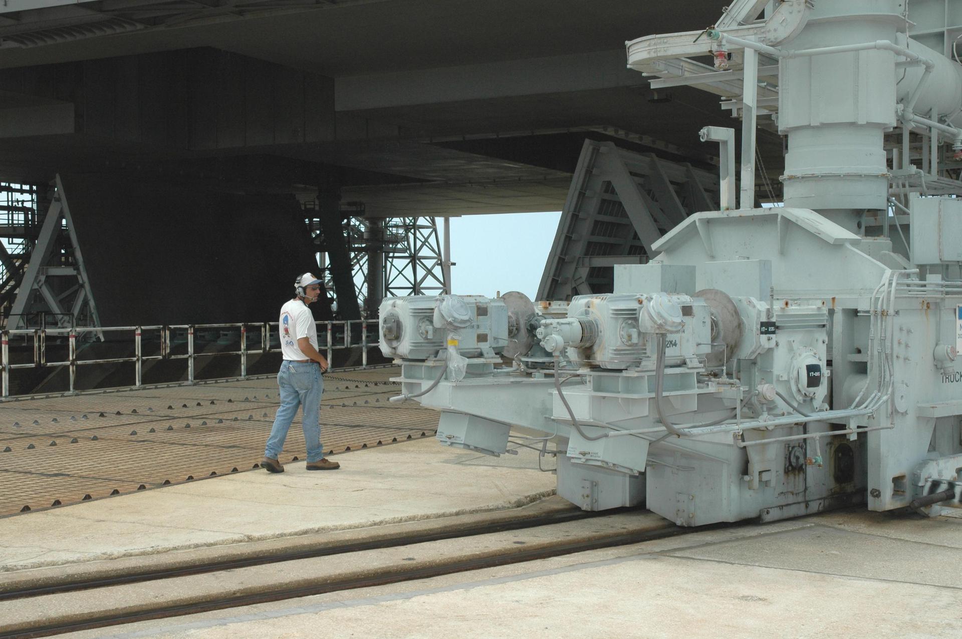 KENNEDY SPACE CENTER, FLA. - A worker on Launch Pad 39B at NASA Kennedy Space Center walks alongside the track of the Rotating Service Structure as it begins rolling back from its position around Space Shuttle Discovery. Rollback of the RSS is a major preflight milestone, typically occurring during the T-11-hour hold on L-1 (the day before launch). Discovery is scheduled to lift off on the historic Return to Flight mission STS-114 at 10:39 a.m. EDT July 26 with a crew of seven. On the mission to the International Space Station the crew will perform inspections on orbit for the first time of all of the Reinforced Carbon-Carbon (RCC) panels on the leading edge of the wings and the Thermal Protection System tiles using the new Canadian-built Orbiter Boom Sensor System and the data from 176 impact and temperature sensors. Mission Specialists will also practice repair techniques on RCC and tile samples during a spacewalk in the payload bay. During two additional spacewalks, the crew will install the External Stowage Platform-2, equipped with spare part assemblies, and a replacement Control Moment Gyroscope contained in the Lightweight Multi-Purpose Experiment Support Structure.