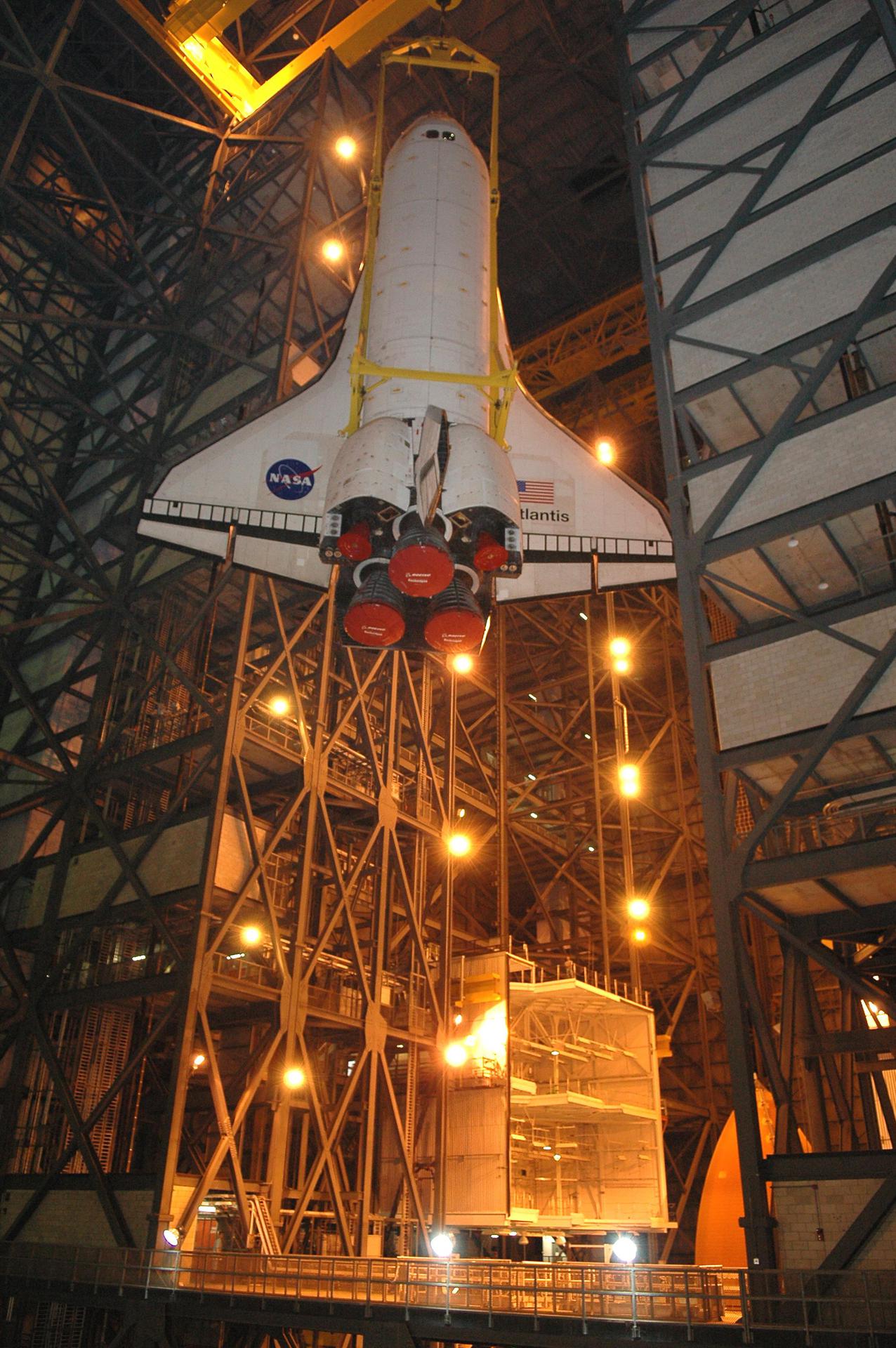 KENNEDY SPACE CENTER, FLA. - In the Vehicle Assembly Building, Space Shuttle Atlantis is lowered into the transfer aisle after being demated from its External Tank_Solid Rocket Booster stack. The orbiter will be rolled back to Orbiter Processing Facility (OPF) bay 1 where processing will begin for mission STS-115, the 19th flight to the International Space Station. The tank, ET-120, is the first redesigned ET to arrive at KSC and will undergo further testing before Return to Flight mission STS-121 next year.