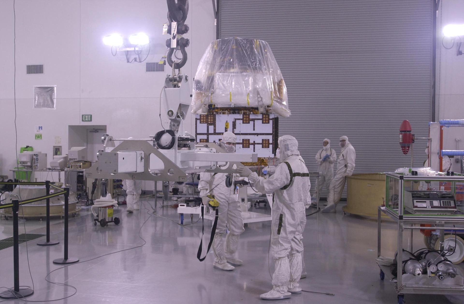 VANDENBERG AIR FORCE BASE, CALIF. — Inside the Astrotech Payload Processing Facility on Vandenberg Air Force Base in California, workers prepare the CALIPSO spacecraft for lifting. CALIPSO will be mated with the upper Delta Payload Attach Fitting (UDPAF). Later the UDPAF will be mated with the lower Delta Payload Attach Fitting, which contains the CloudSat satellite. The PAF is the interface between the spacecraft and the second stage of the rocket. CALIPSO stands for Cloud-Aerosol Lidar and Infrared Pathfinder Satellite Observation. CALIPSO and CloudSat are highly complementary satellites that will provide never-before-seen 3-D perspectives of how clouds and aerosols form, evolve, and affect weather and climate. CALIPSO and CloudSat will fly in formation with three other satellites in the A-train constellation to enhance understanding of our climate system. Launch of CALIPSO_CloudSat aboard a Boeing Delta II rocket is scheduled for 3:01 a.m. PDT Sept. 29.