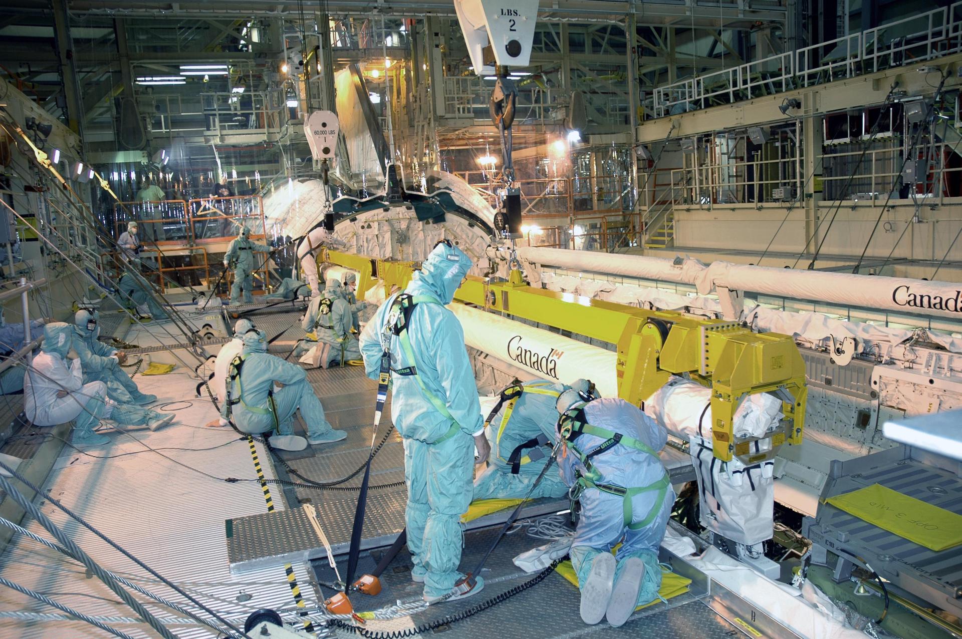 KENNEDY SPACE CENTER, FLA. -In NASA Kennedy Space Center’s Orbiter Processing Facility, bay 3, workers prepare to remove the orbiter boom sensor system from Discovery’s payload bay. The boom will undergo inspection. The orbiter will be processed for the second Return to Flight mission, STS-121. The orbiter boom sensor system, built in Canada, was used during Return to Flight mission STS-114 to provide more extensive inspection and photography of Discovery.